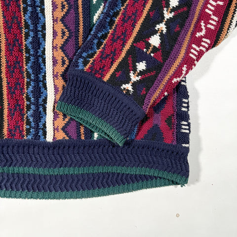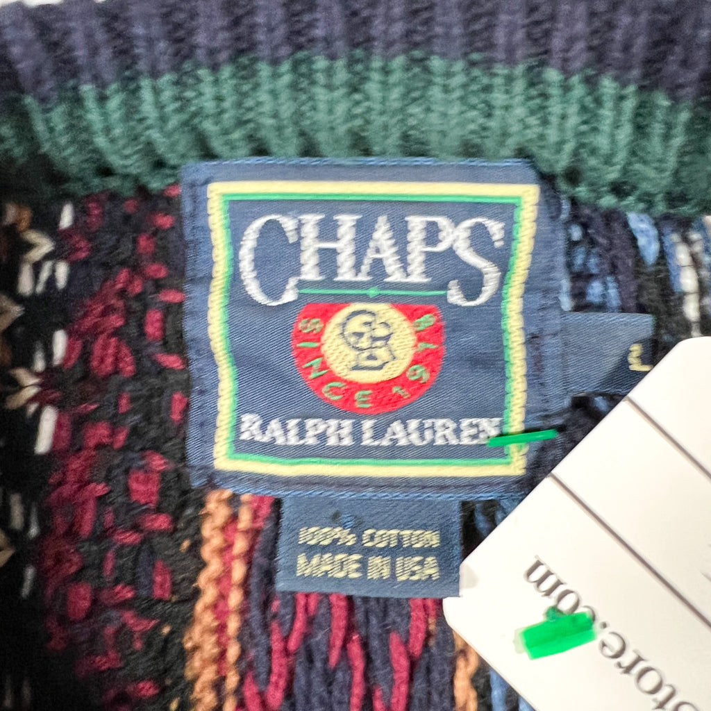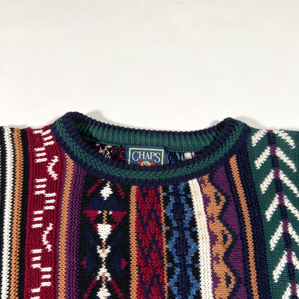 Vintage Chaps by Ralph Lauren knit sweater from the 1990s featuring a bold, textured, multicolor pattern in the iconic Coogi-style aesthetic. This piece has a thick, high-quality knit with rich color blocking and geometric motifs throughout, giving it that classic 90s streetwear and hip-hop era look without being an actual Coogi.