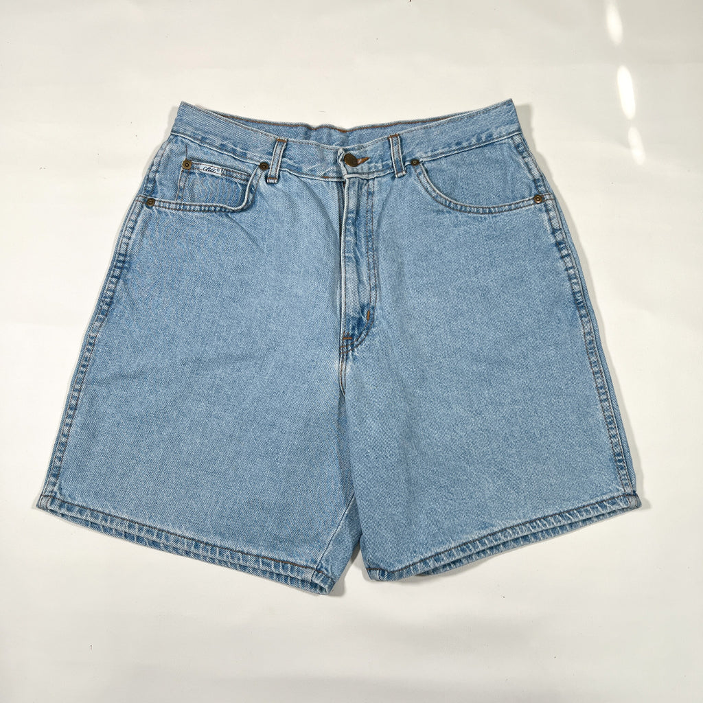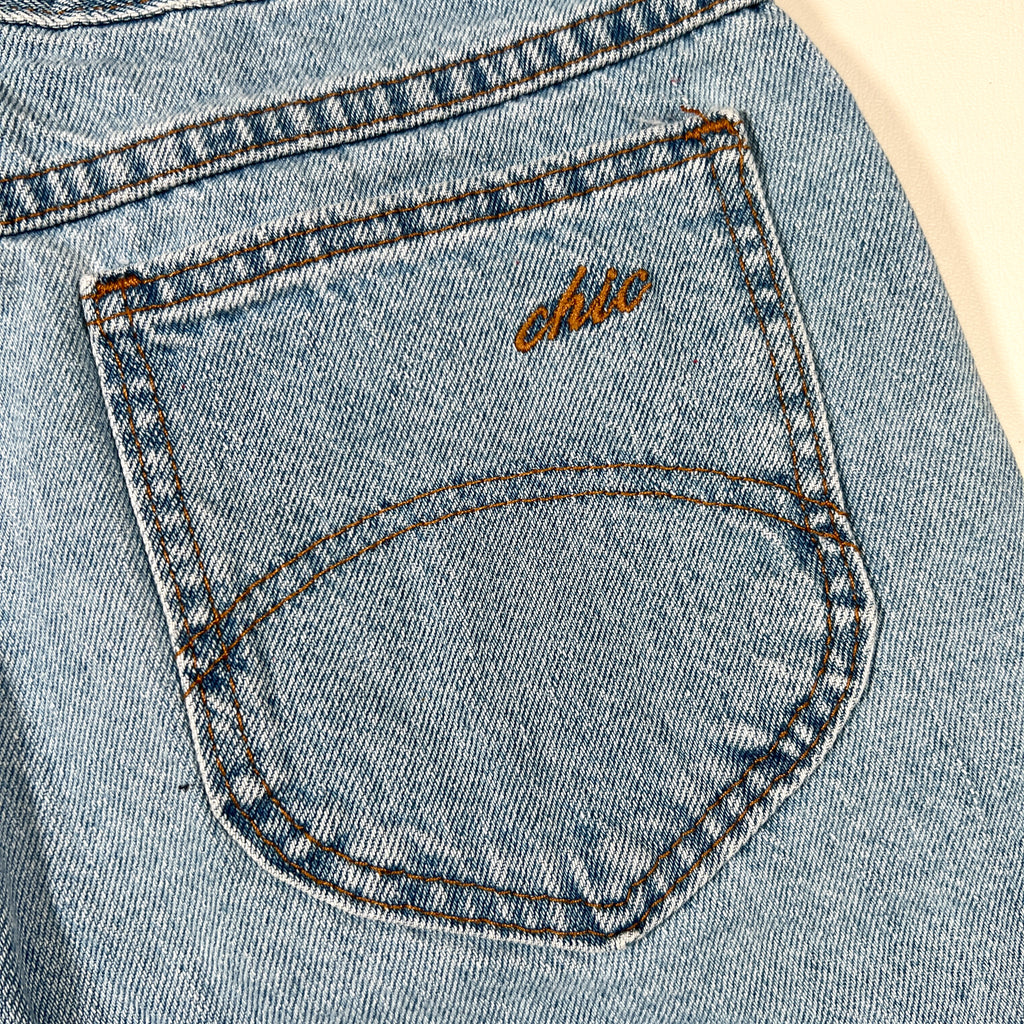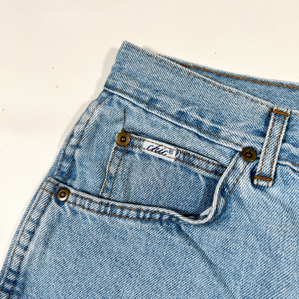 Clean vintage 90’s Chic denim shorts in a light wash with a classic high-rise silhouette. Simple, timeless look with subtle fading throughout and a slightly structured feel typical of older denim.