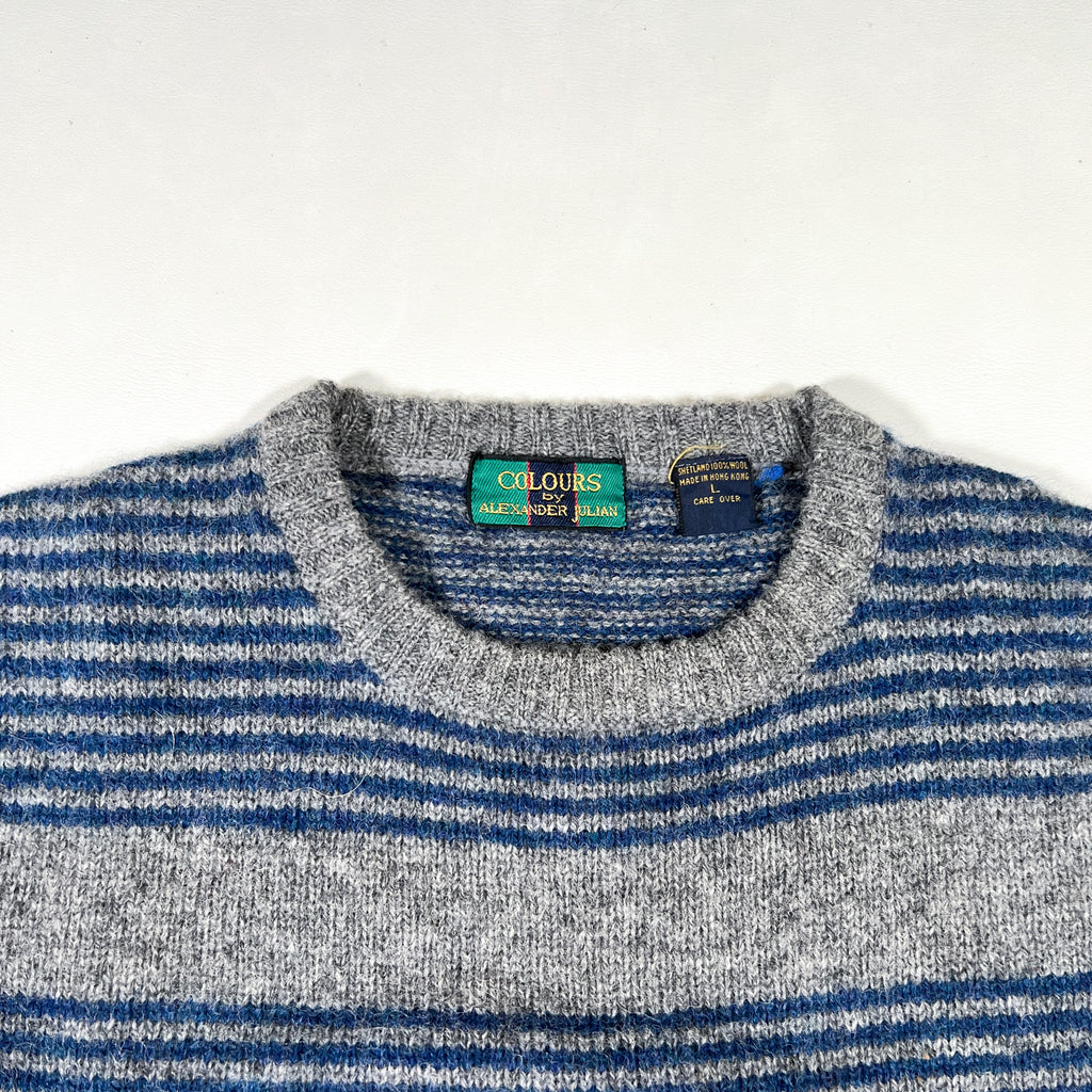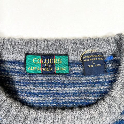 Classic 1990s Colours by Alexander Julian Shetland wool crewneck sweater featuring a timeless horizontal stripe pattern in blue, grey, and subtle pops of red and gold. Made in Hong Kong from 100% Shetland wool, this piece delivers both warmth and a rich texture typical of Alexander Julian’s quality knitwear from the era.