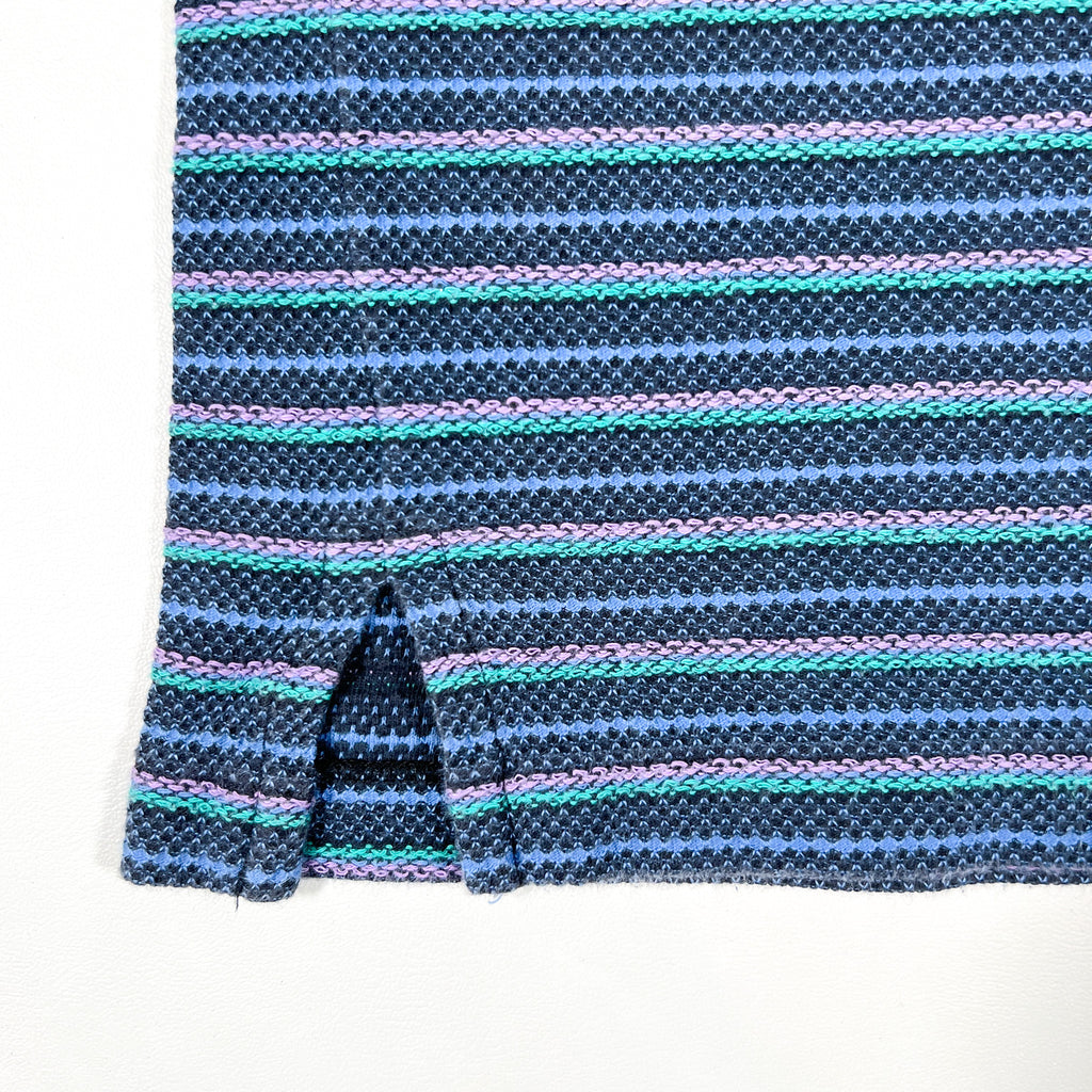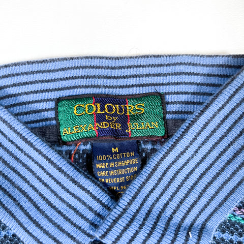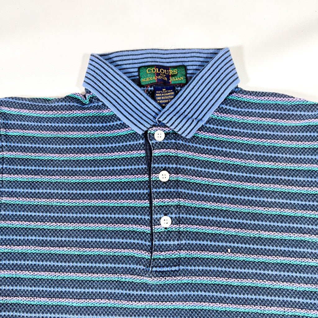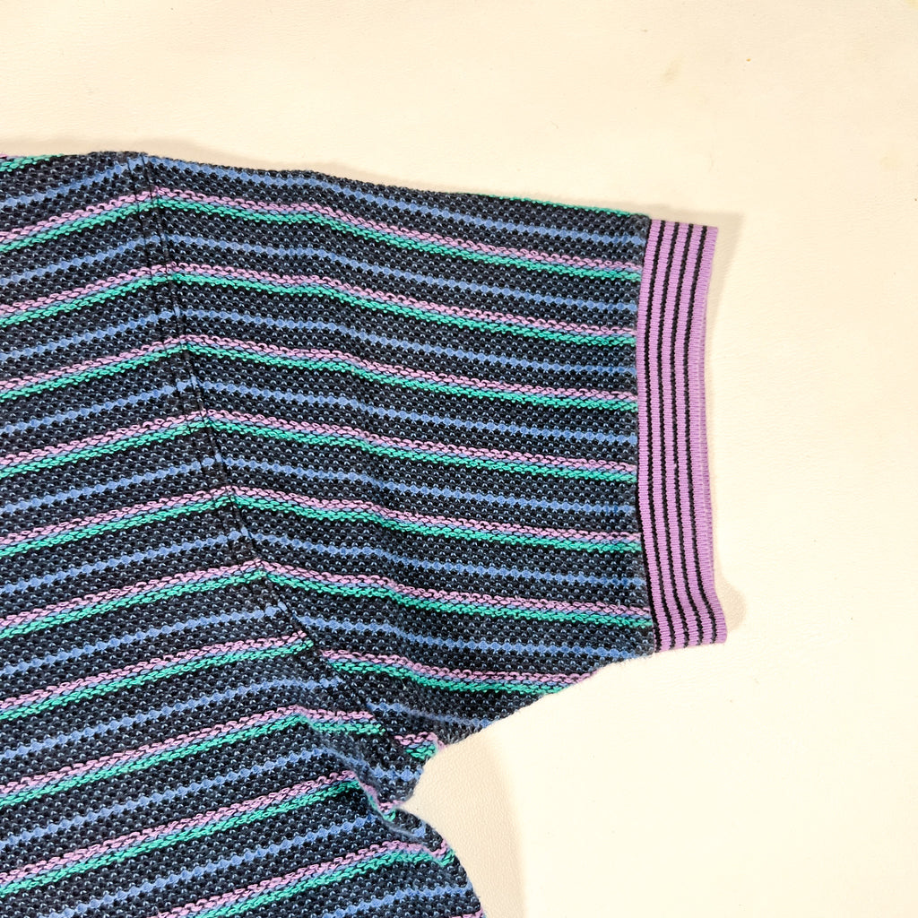 Vintage 1990s Colours by Alexander Julian short sleeve polo featuring a textured knit stripe pattern in shades of navy, teal, and lavender. Finished with a contrasting light blue striped collar and purple cuff accents — a perfect example of the bold color-blocking and pattern mixing that defined Alexander Julian’s 90s aesthetic.