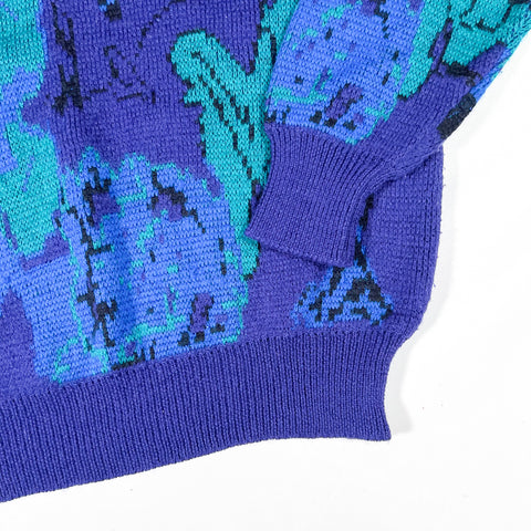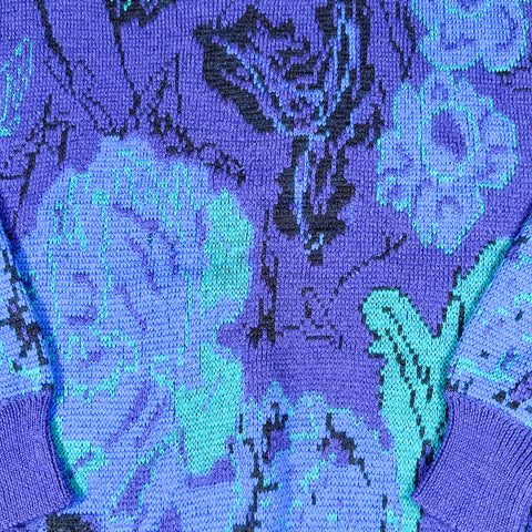 Vibrant vintage 1990s Compositions sweater featuring an abstract floral design in deep purples, blues, teals, and black. Made from a soft and warm 50% wool / 50% acrylic blend, this piece combines comfort with bold retro style.