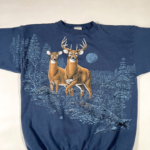 Vintage 1990s crewneck sweatshirt by Cotton Grove Designs featuring a detailed wildlife scene with a buck and doe standing in a moonlit forest. Classic outdoors graphic with rich blues and earthy tones, capturing the iconic lodge and nature aesthetic popular in the 90s.