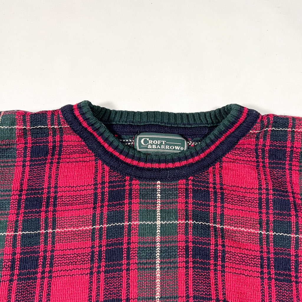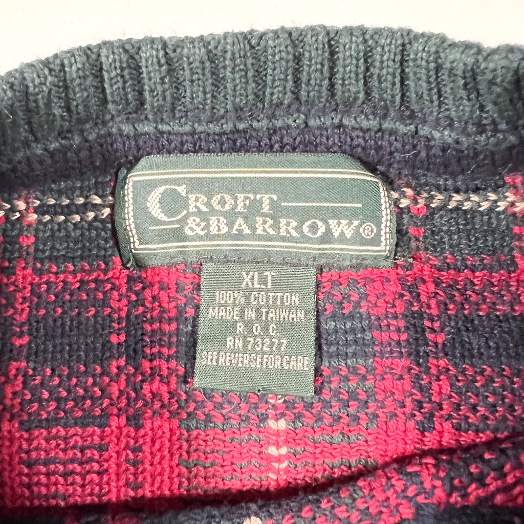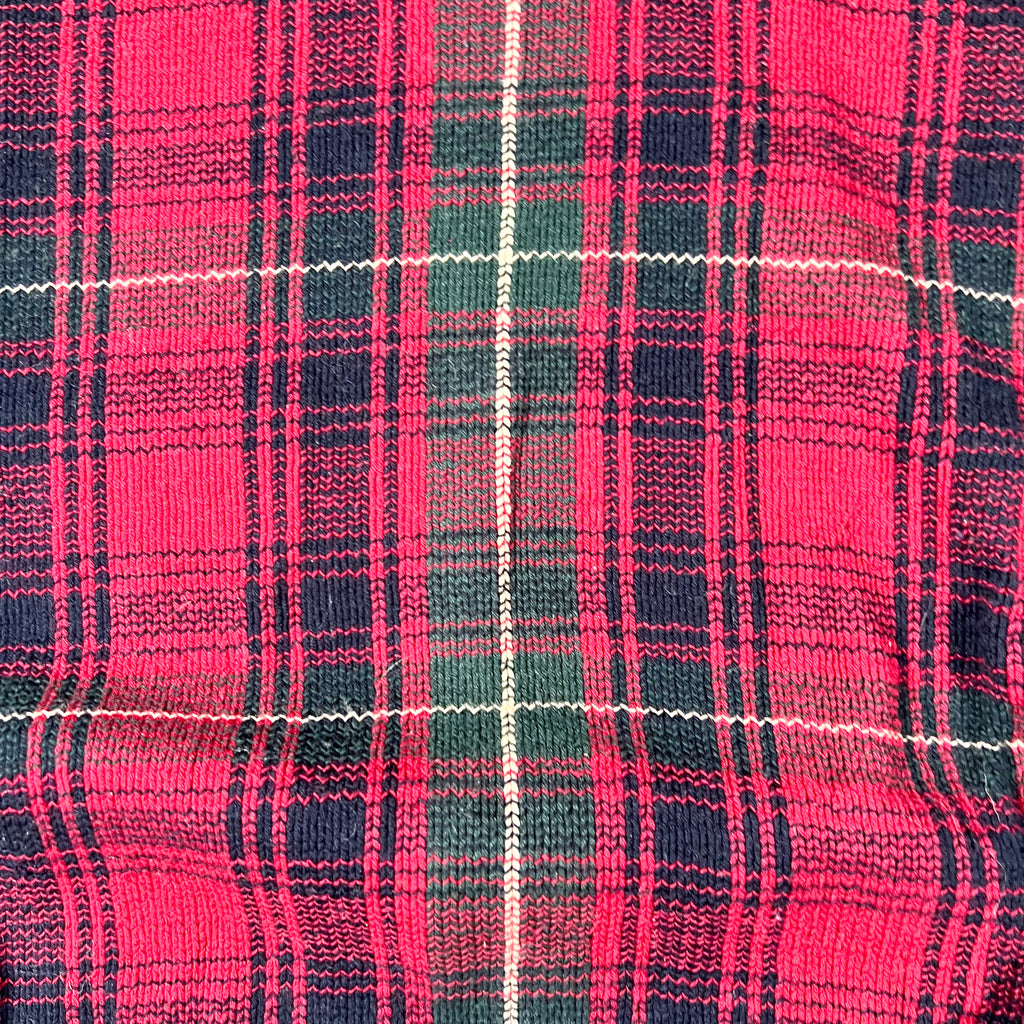 Classic vintage 90’s Croft & Barrow plaid knit sweater in a bold red, green, and navy tartan pattern. 100% cotton, made in Taiwan. Thick ribbed cuffs, collar, and hem with matching stripe detailing. Tagged XLT but fits like a standard XL with a relaxed vintage silhouette.