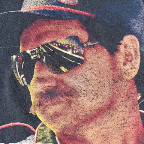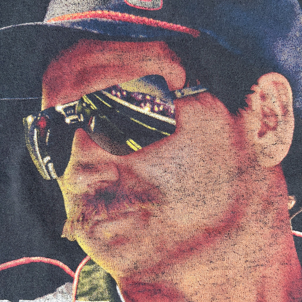 Classic early 1990s Dale Earnhardt Sr. NASCAR tee featuring a large, full-color portrait of The Intimidator himself wearing his signature shades and GM Goodwrench cap. The reflective detail in the sunglasses and bold red “Dale Earnhardt 3” graphic make this one of the most iconic designs from the Nutmeg Mills era.