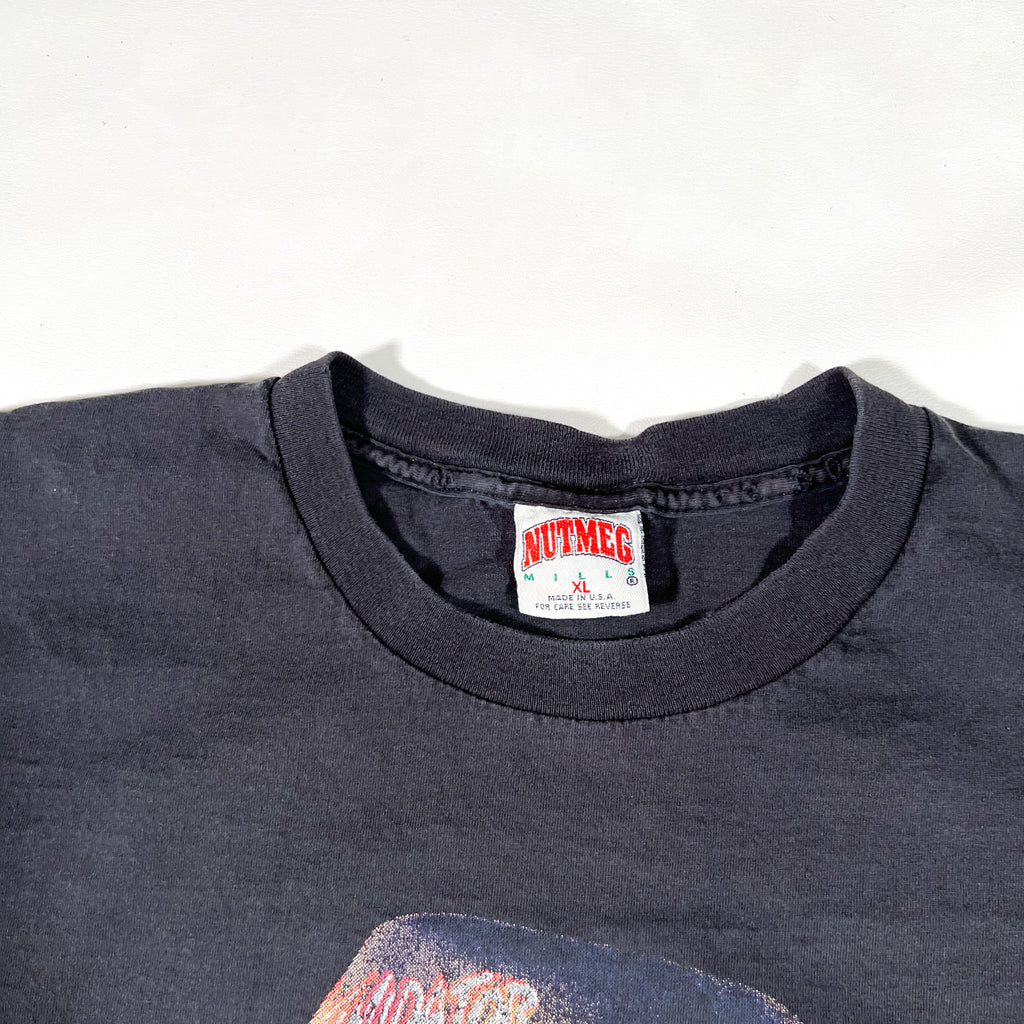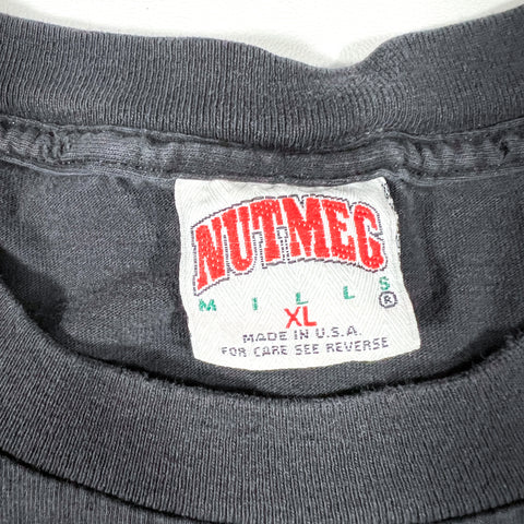 Printed on a Nutmeg Mills Made in USA tag, known for its thick cotton blanks and durable screen prints. A staple piece for any NASCAR or vintage racing collection.