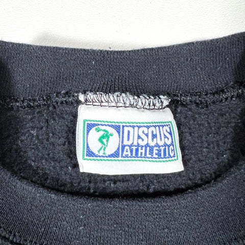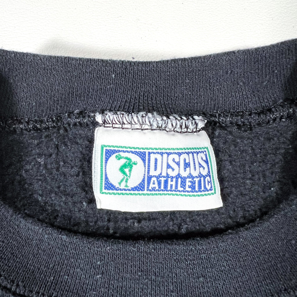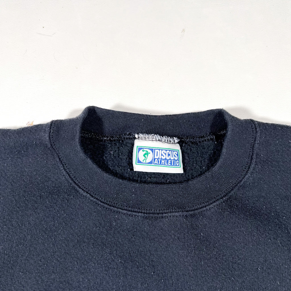 Vintage 1990s Discus Athletic crewneck sweatshirt in classic black, featuring durable USA-made construction and a timeless athletic silhouette. Made from heavyweight fleece with a soft brushed interior, this vintage Discus Athletic sweatshirt includes a ribbed crewneck collar, ribbed cuffs, and ribbed hem, finished with the iconic Discus logo tag at the hem.