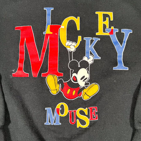 Vintage Mickey Mouse crewneck sweatshirt from the 1990s featuring a colorful “MICKEY MOUSE” graphic across the chest with Mickey hanging playfully from the lettering. Classic Disney character artwork with bold primary colors on a black fleece base.