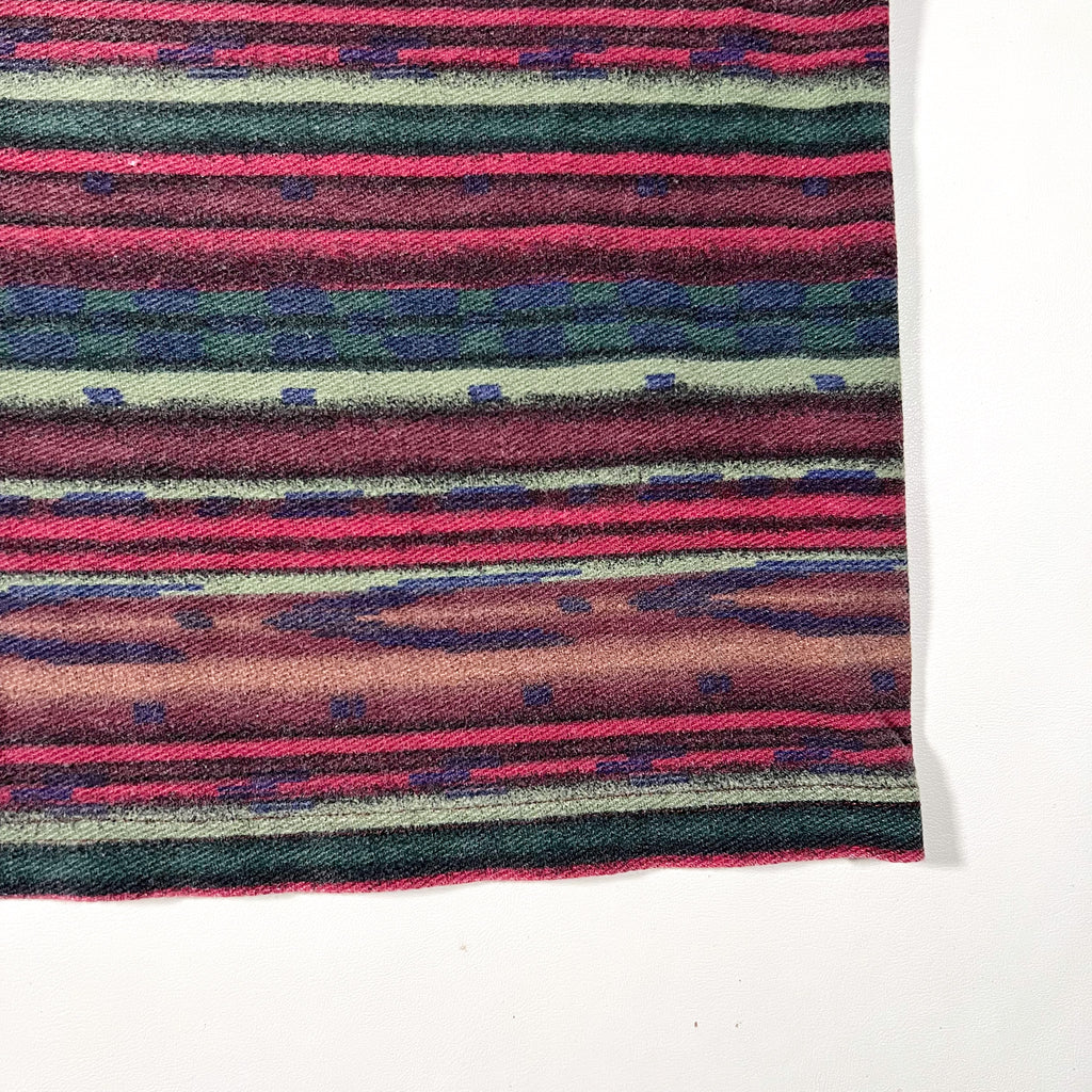 This is a vintage 1990s Faded Glory heavyweight pullover shirt featuring a bold multicolor Southwest-inspired stripe pattern in reds, greens, blues, and purples. Made from thick woven cotton with a chambray denim-trimmed neckline and three-button placket. Has an oversized, relaxed 90s fit — comfortably fits between a 2XL and 3XL.