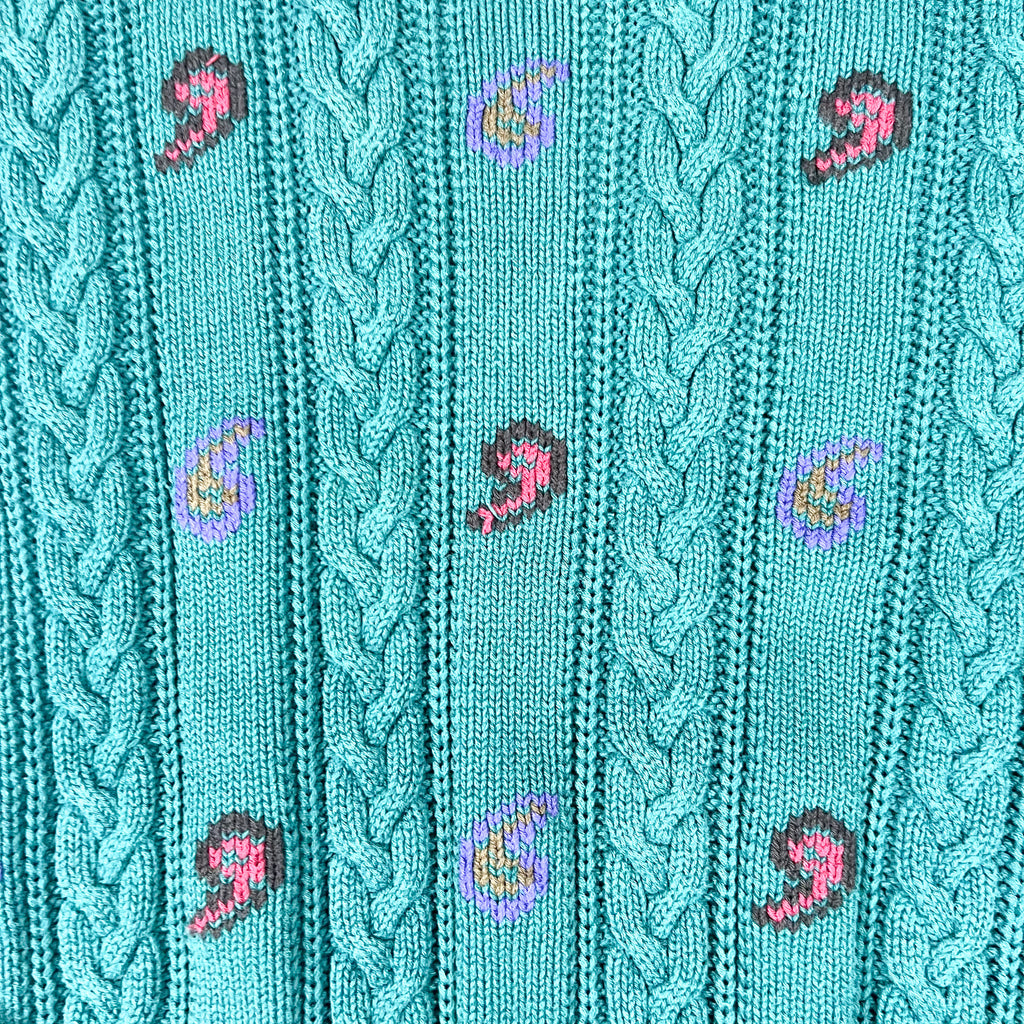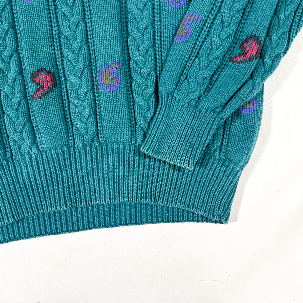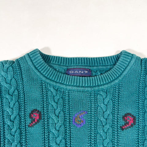 Search terms: vintage gant sweater, 90s cable knit, paisley knit sweater, teal knit sweater, retro preppy sweater, embroidered knit, cobblestore vintage sweaters