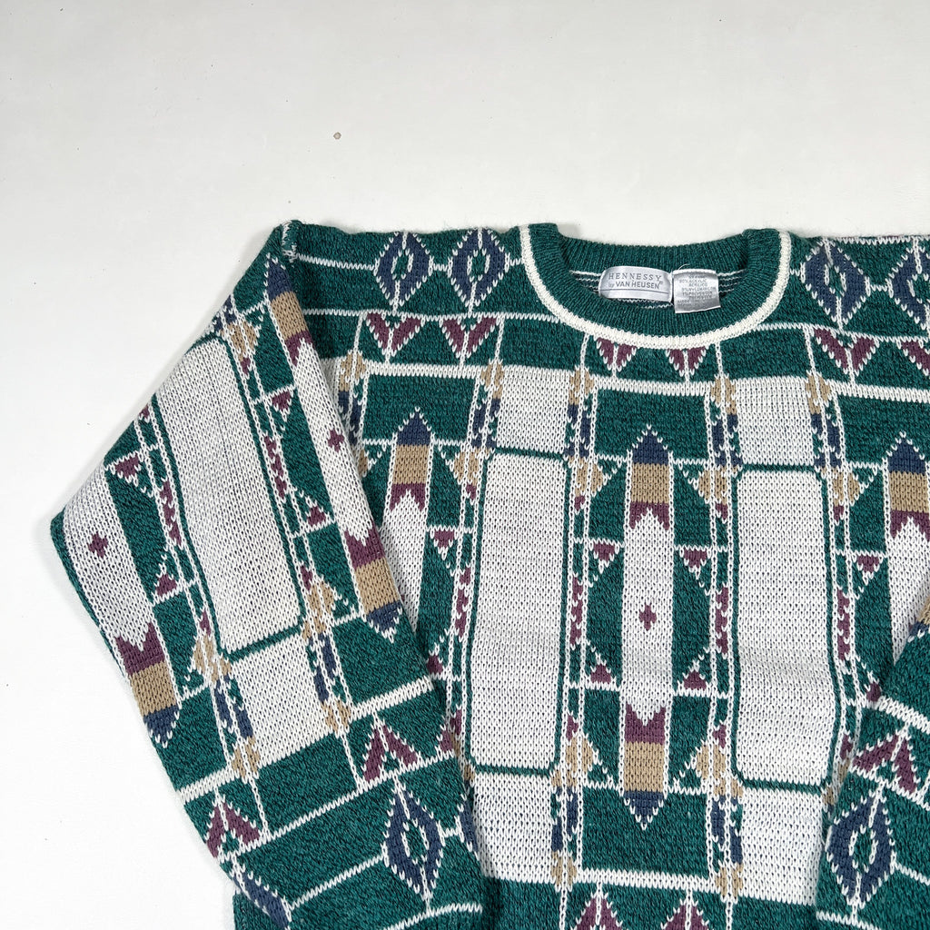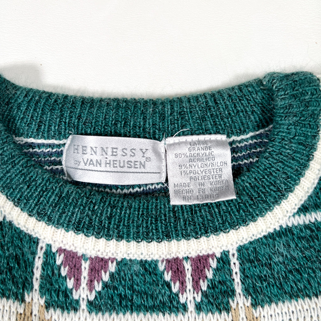 This vintage 1990’s Hennessy by Van Heusen sweater features a bold geometric pattern in forest green, ivory, tan, and plum tones — a signature look of early 90s knitwear. The design includes intricate rectangular and diamond motifs, giving it a distinctly retro yet wearable aesthetic.