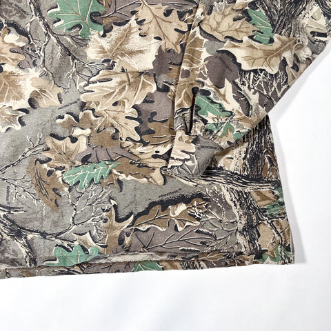 Authentic vintage 1990s Jerzees Outdoors Advantage camouflage T-shirt featuring a classic all-over woodland print with oak leaves, branches, and tree bark in muted earth tones. Soft, lightweight cotton jersey with a well-worn, broken-in feel and a relaxed, boxy 90s fit. A true outdoor classic with strong vintage hunting aesthetics.