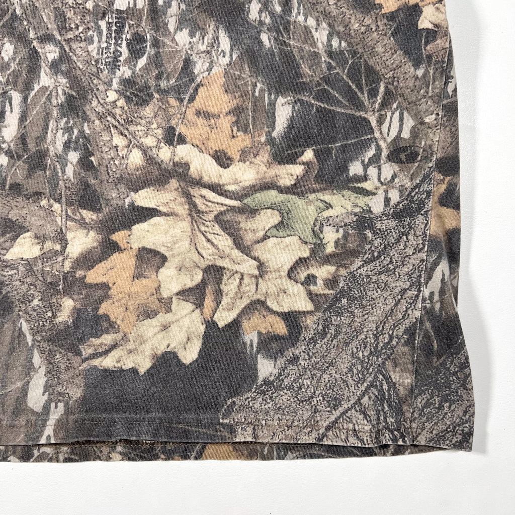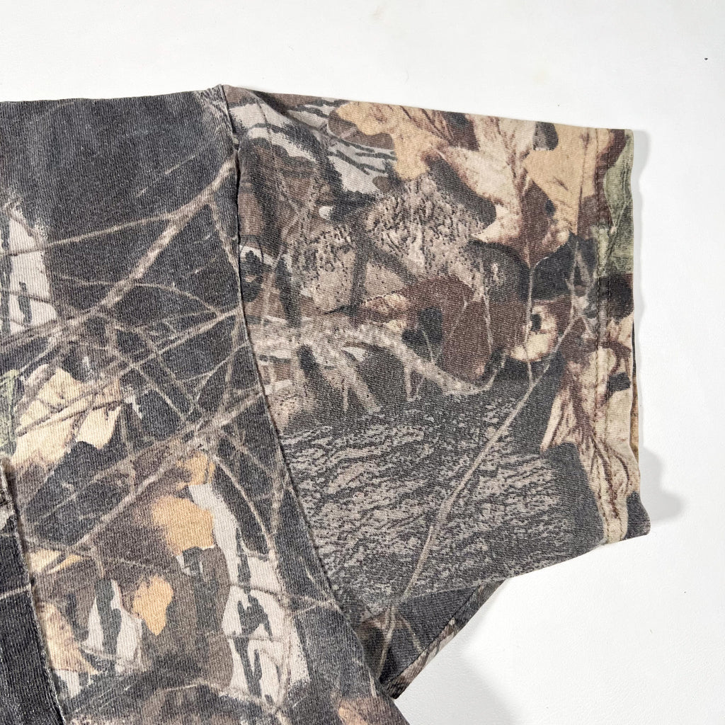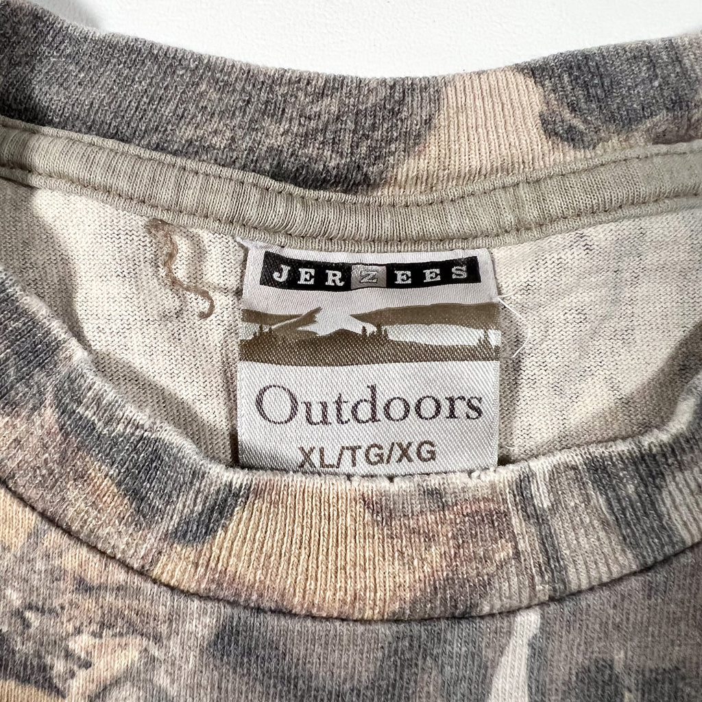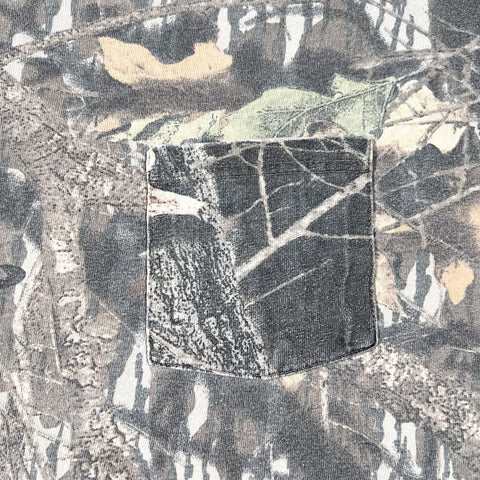 Classic vintage 90’s Jerzees Outdoors camo T-shirt with a full Realtree-style all-over print and matching chest pocket. Soft, broken-in feel with great natural fade from age. Ideal oversized fit for everyday wear or outdoor styling.