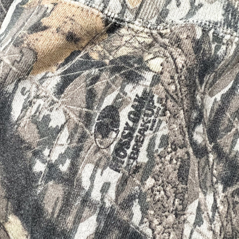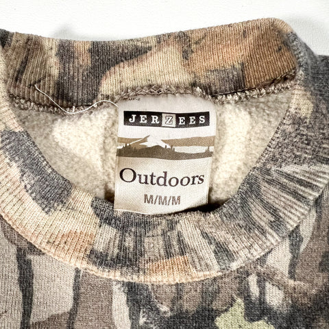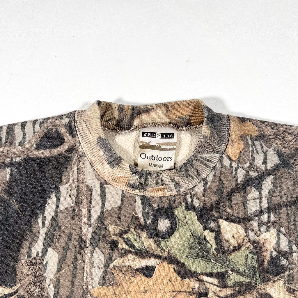 Vintage Jerzees Outdoors crewneck sweatshirt featuring an allover Mossy Oak Break-Up camouflage pattern. Soft fleece-lined interior with ribbed collar, cuffs, and hem. Classic 1990s outdoor camo piece with a relaxed, easy-to-layer fit—great for everyday wear or collectors of vintage hunting apparel.