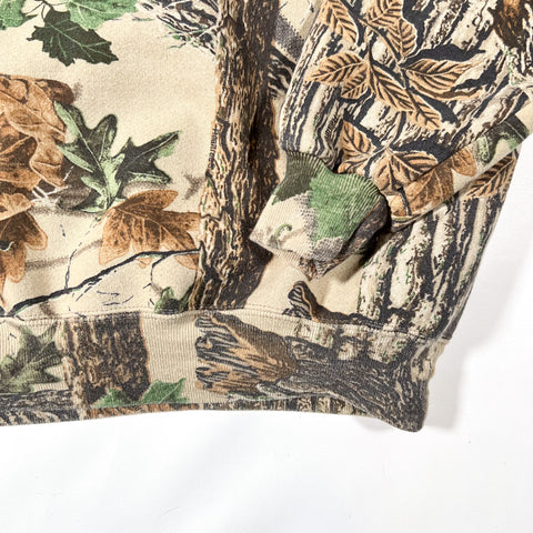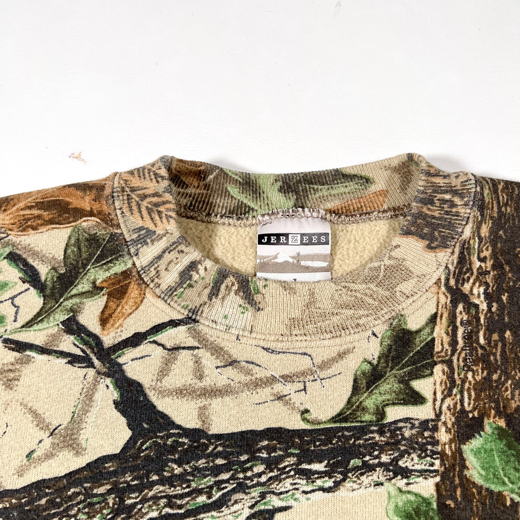Authentic 1990s Jerzees Outdoors crewneck featuring a classic Realtree all-over camouflage print. Full woodland pattern with detailed tree bark, branches, and fall leaves on a tan base. Heavyweight fleece construction with a soft, worn-in interior, finished with ribbed collar, cuffs, and hem. A true 90s outdoor staple that works equally well styled casually or as a functional layering piece.
