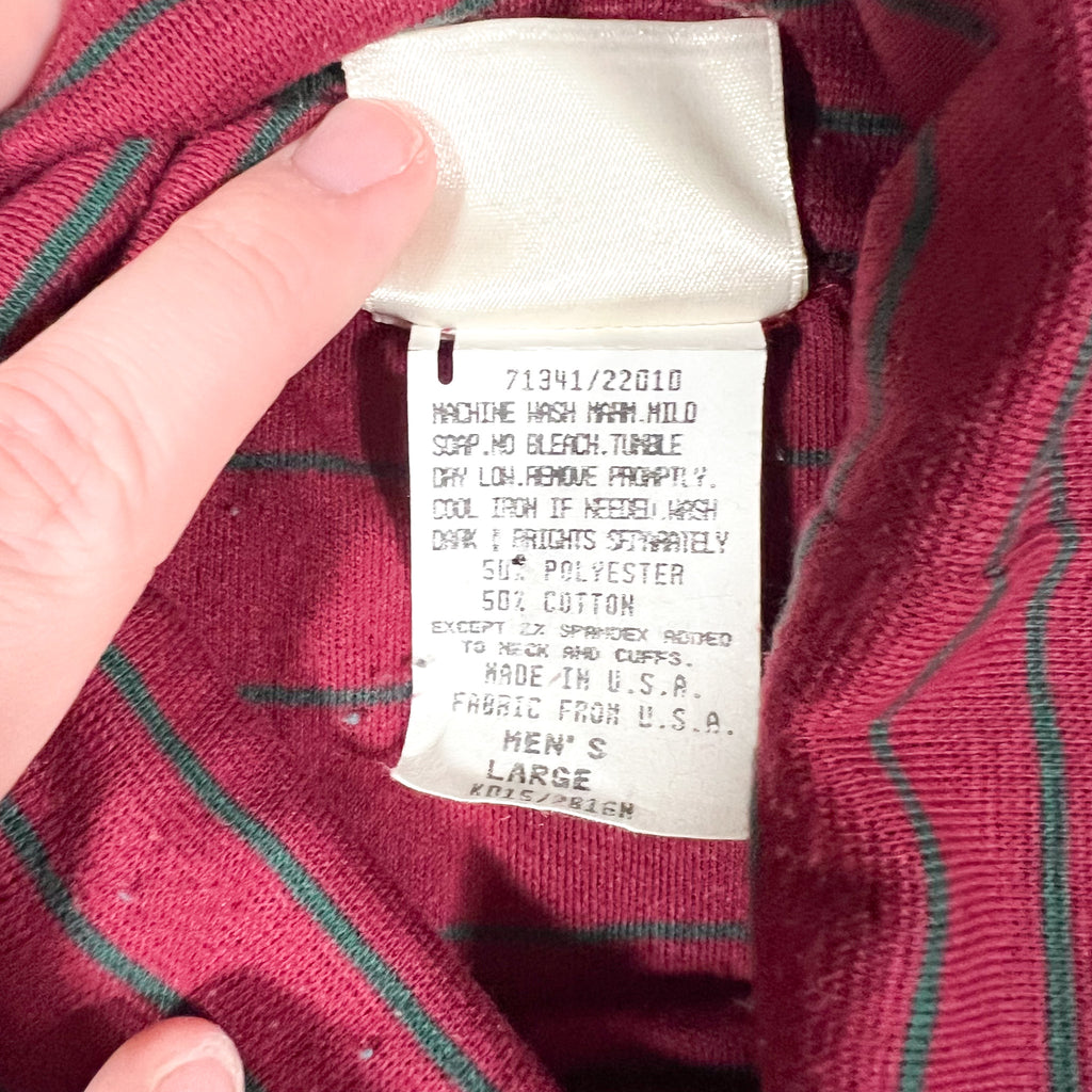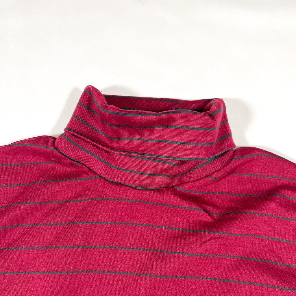 Classic 1990s L.L. Bean striped turtleneck made in the USA, featuring a deep red base with thin green horizontal stripes. Soft and comfortable knit with a structured turtleneck collar and relaxed vintage fit. An easy layering piece that works well on its own or under jackets and vests, with timeless outdoor and heritage appeal.
