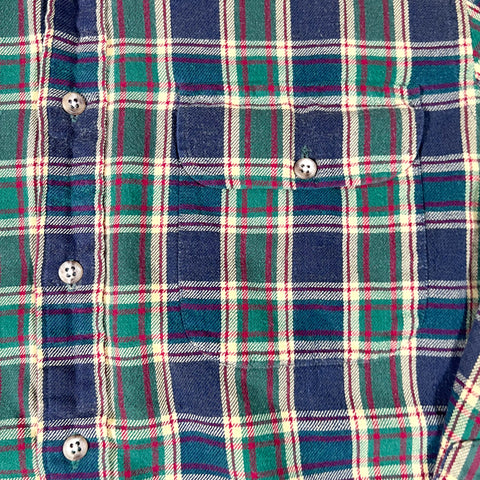 Classic 1990s Lands’ End flannel in a traditional navy, green, cream, and red plaid. Made from soft 100% cotton and cut in that timeless button-down collar silhouette. Perfect everyday flannel with an easy fit, chest pocket, and rich heritage colors.