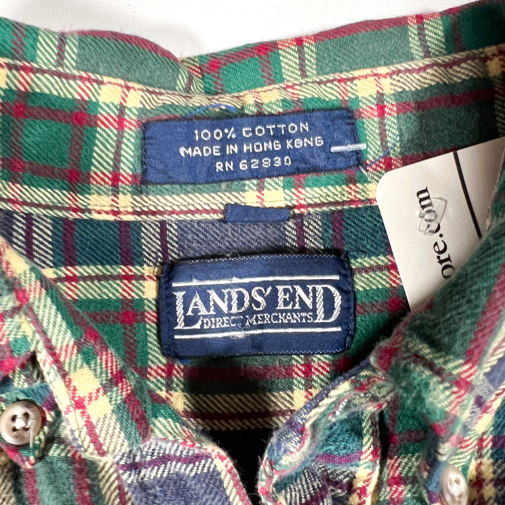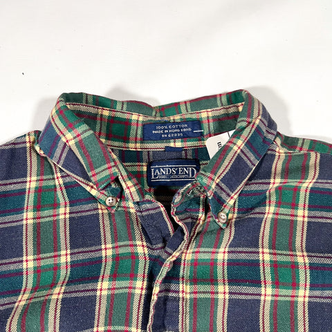 Search terms: lands end flannel plaid shirt vintage 90s button down cotton soft flannel outdoors prep heritage navy green tartan fall winter layer menswear unisex retro shirt classic flannel