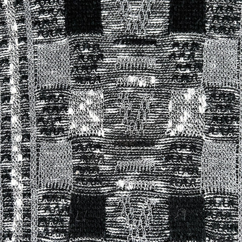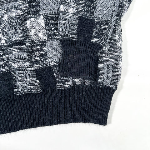 Eye-catching 90’s geometric patterned sweater from Limited Editions by Expressions, made in Taiwan. Features a bold black, silver, and gray textured knit design with a dimensional, woven look reminiscent of classic Coogi-inspired styles.