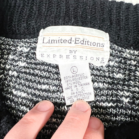 Search terms: vintage sweater, 90s knitwear, Coogi style sweater, geometric sweater, retro pattern knit, Limited Editions Expressions, made in Taiwan sweater, textured knit, vintage streetwear, grayscale sweater