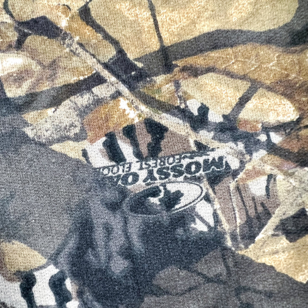 Vintage 1990’s Mossy Oak all-over camouflage crewneck sweatshirt, made on a Jerzees Outdoors blank. Classic forest camo pattern with printed Mossy Oak logos throughout. Soft fleece interior with a comfortable, broken-in feel that’s ideal for layering or everyday wear.