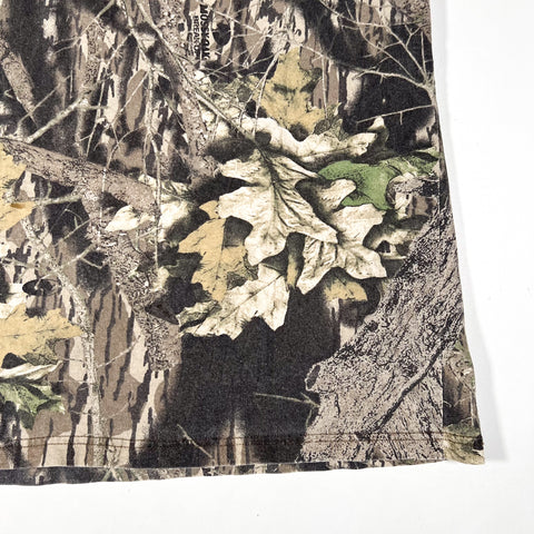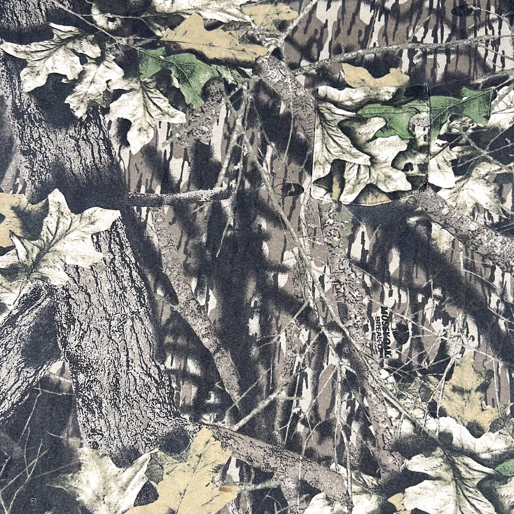 Vintage Mossy Oak Break-Up camouflage t-shirt featuring the classic high-contrast woodland pattern with layered branches, leaves, and bark textures. Includes a matching chest pocket that blends into the camo print. Lightweight cotton feel with a relaxed, boxy 1990s fit.