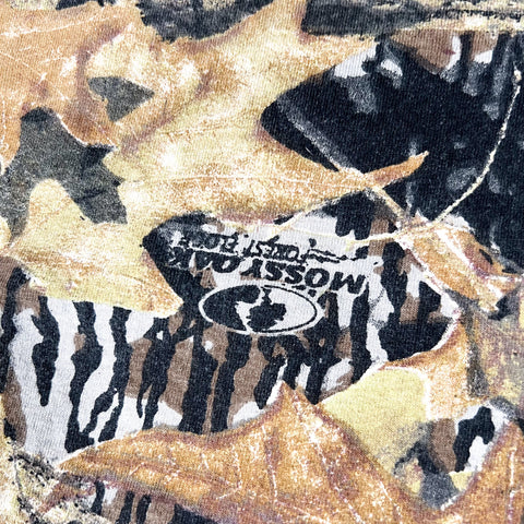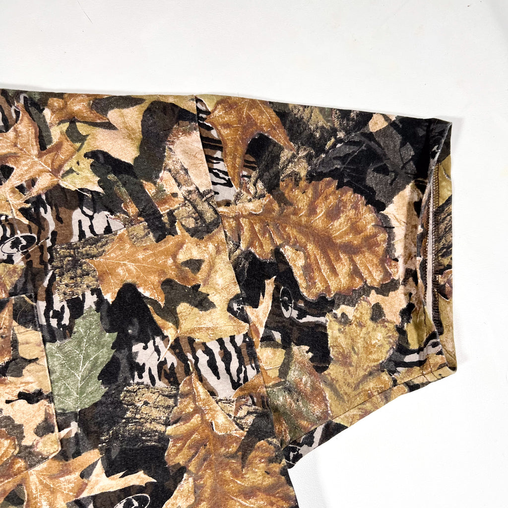 Vintage Mossy Oak Forest Floor camouflage t-shirt featuring the classic all-over leaf and woodland pattern. Includes a matching chest pocket that blends seamlessly into the camo print. Lightweight cotton feel with a relaxed, boxy 1990s fit that works well for everyday wear.