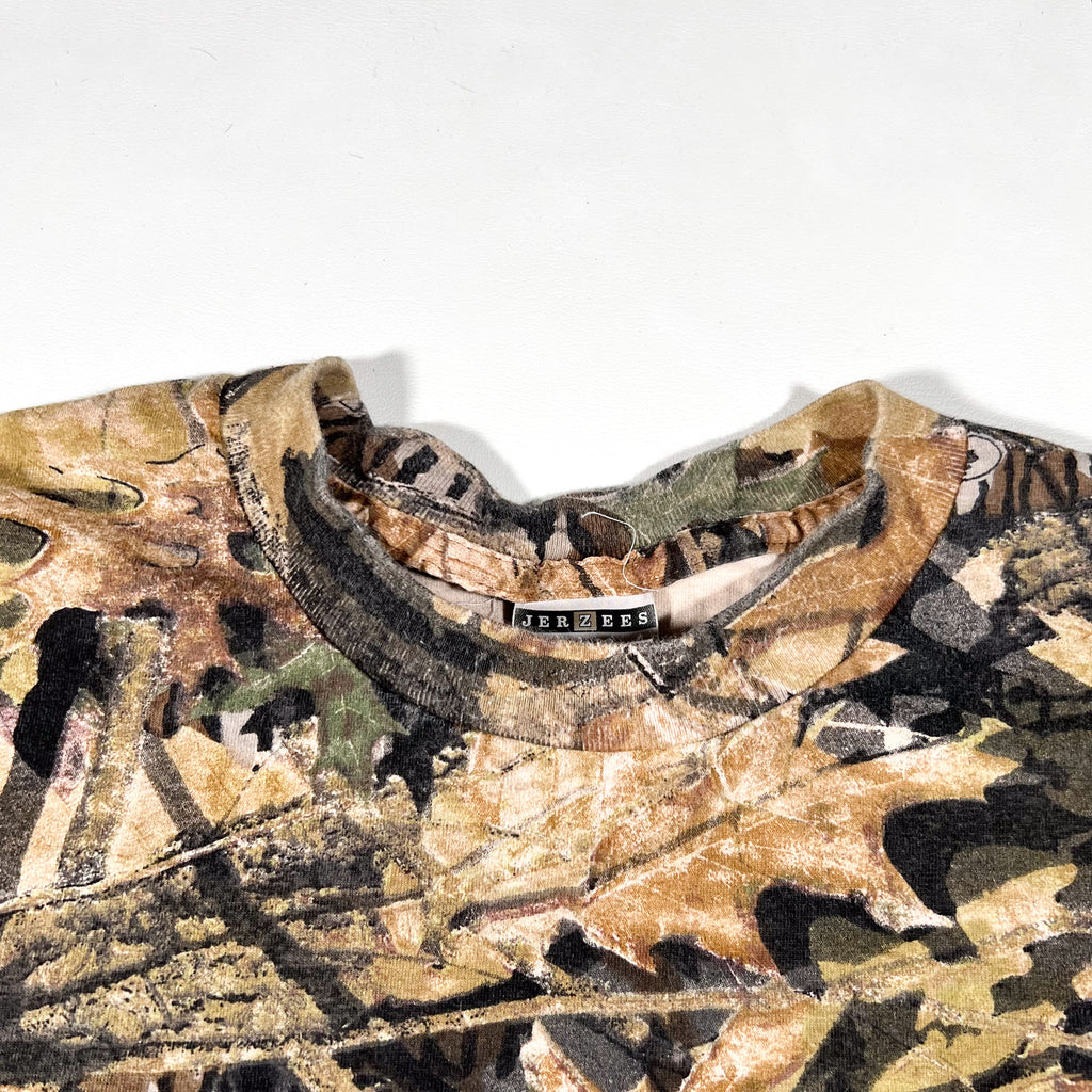 Authentic Mossy Oak Forest Floor camouflage pattern. Features a chest pocket. Jerzees Outdoors tag.