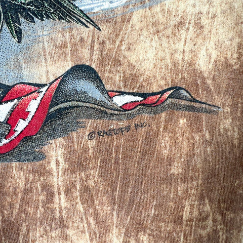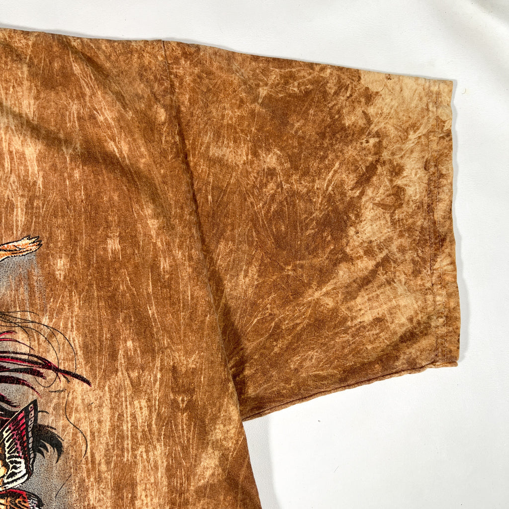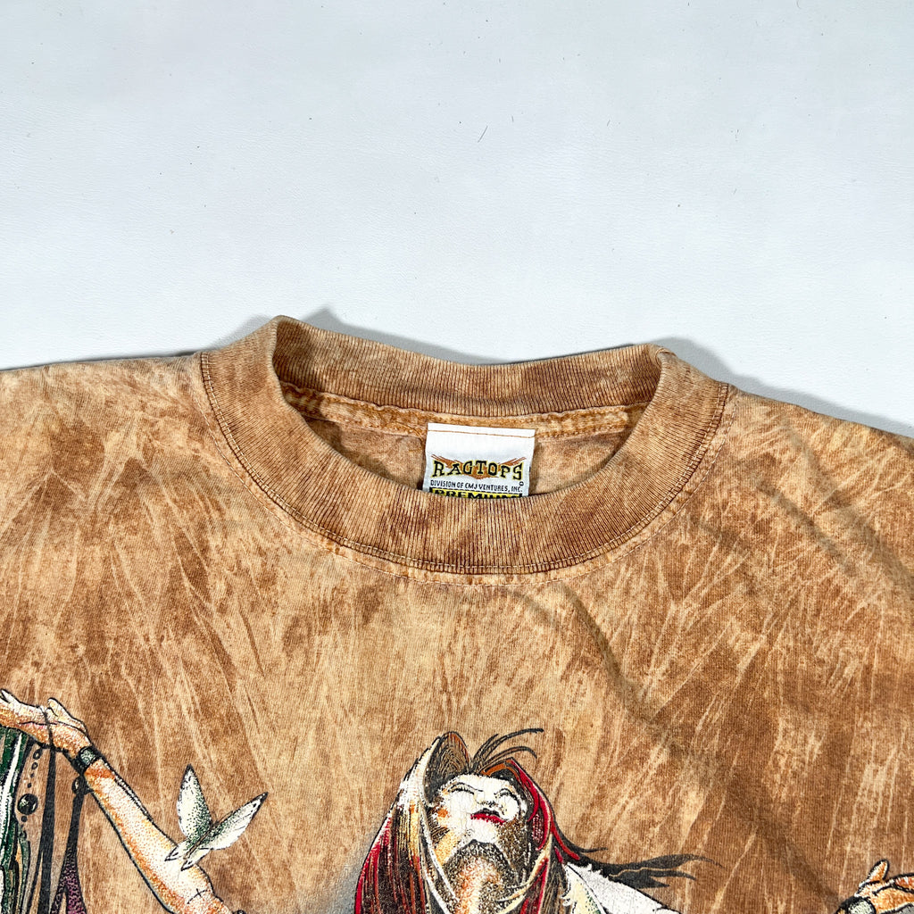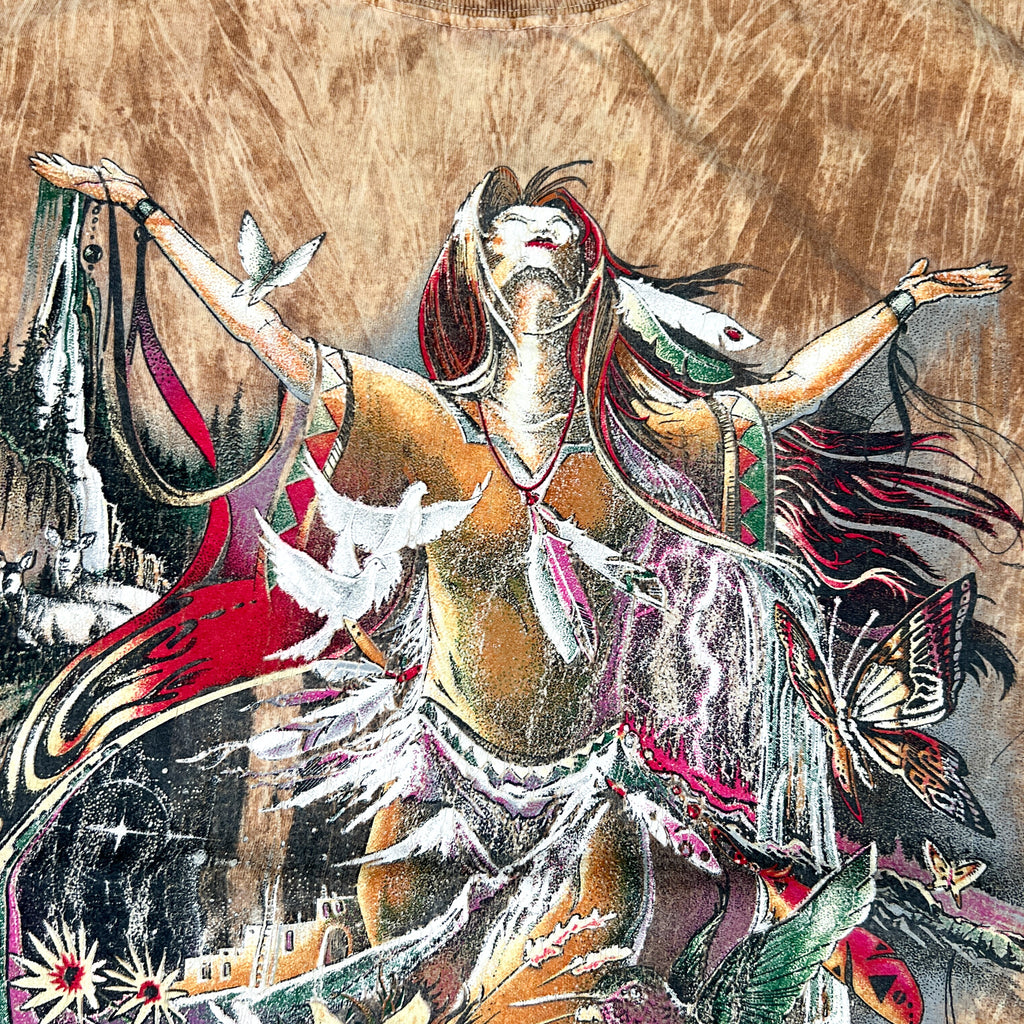 Authentic vintage 1990s graphic tee featuring a bold all-over print Native Spirit artwork. This piece showcases a highly detailed front graphic with nature elements, birds, and a flowing scenic composition on a mineral-wash brown cotton body. Great oversized drape and strong 90s graphic aesthetic. Made in the USA on a Ragtops Premium blank.