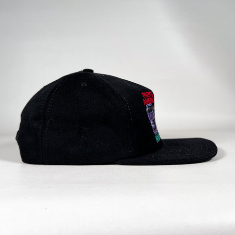 This hat is made in the USA and produced by Winner International (tag reads “Since 1918”), featuring a structured crown, flat brim, and adjustable snapback closure. Timeless black colorway with vibrant embroidery that still pops, making it a great wearable or display piece for NASCAR and racing collectors.