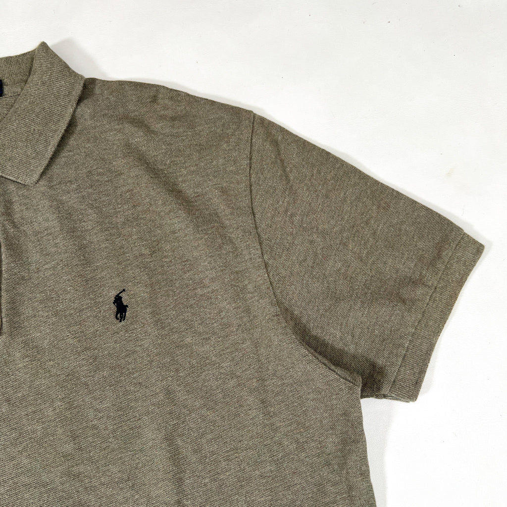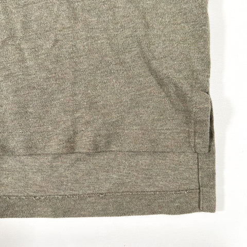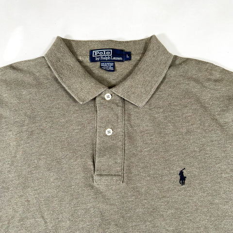 Classic 1990s Polo by Ralph Lauren short sleeve polo in a heather gray tone, made in the Northern Mariana Islands, USA from soft 100% cotton piqué fabric. Features the signature navy Polo pony embroidery on the chest, two-button placket, ribbed collar, and side vents at the hem.
