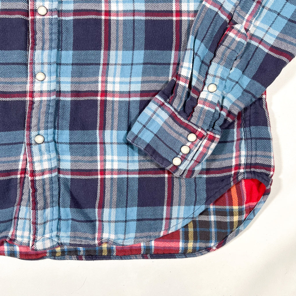 Classic 90’s Polo by Ralph Lauren double-faced flannel made from all cotton. Features a soft brushed exterior, contrasting interior plaid, pearl snap buttons, and western-style flap pockets. Blue, red, and navy plaid with great structure and warmth. Fits like a modern medium/large.