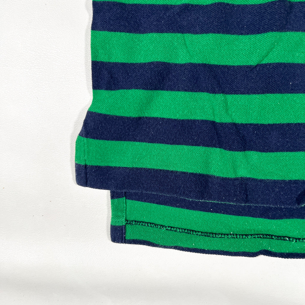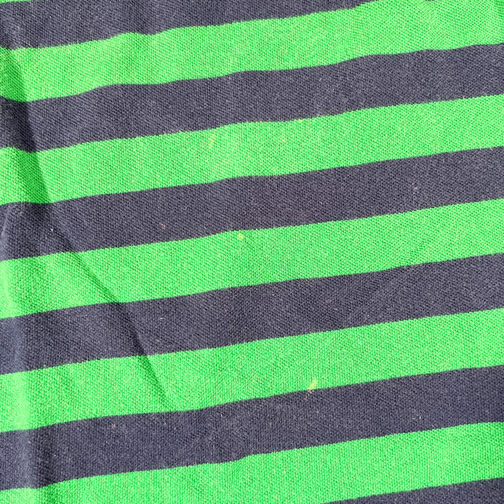 Timeless preppy style from Ralph Lauren, this vintage 1990’s polo shirt features bold green and navy horizontal stripes with the signature embroidered polo player logo on the chest. Made from 100% cotton, this piece is soft yet structured, perfect for everyday wear.