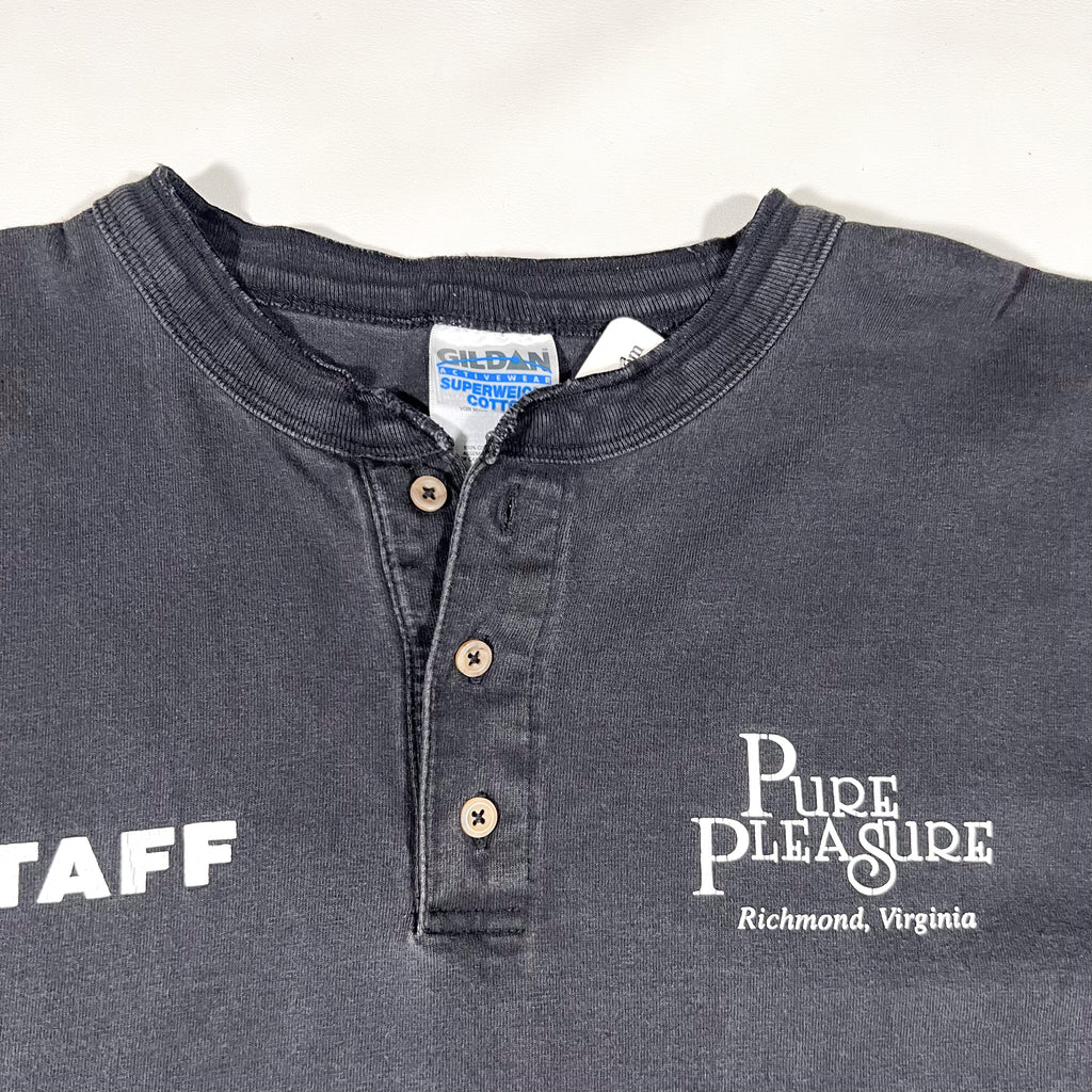 Classic 90’s Pure Pleasure (Richmond, Virginia) staff henley tee, featuring front and back STAFF prints and a 3-button placket. Made on a Gildan Superweight cotton blank with a perfectly broken-in feel and that true vintage fade. A great piece of Richmond history with a unique henley construction you don’t see often.
