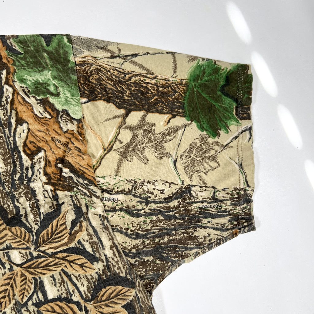 Classic vintage 90’s Realtree camo all-over print t-shirt featuring a full woodland tree bark and leaf pattern throughout, including the chest pocket. Great example of early outdoor camo tees with a true vintage Jerzees Outdoors tag.