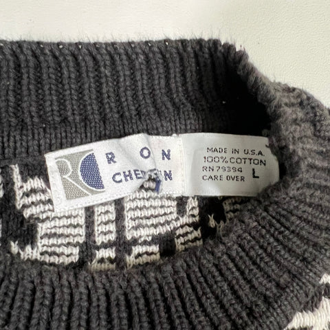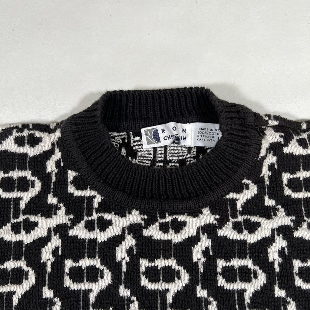 Search terms: vintage Ron Chereskin sweater, 90s designer knit, USA made sweater, geometric pattern sweater, retro black and white pullover, minimalist knitwear, 90s menswear, high quality cotton sweater, graphic knit vintage