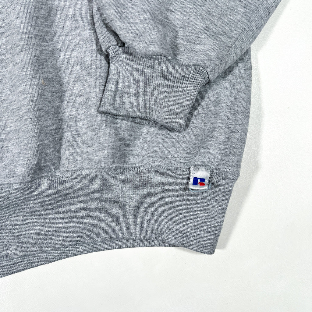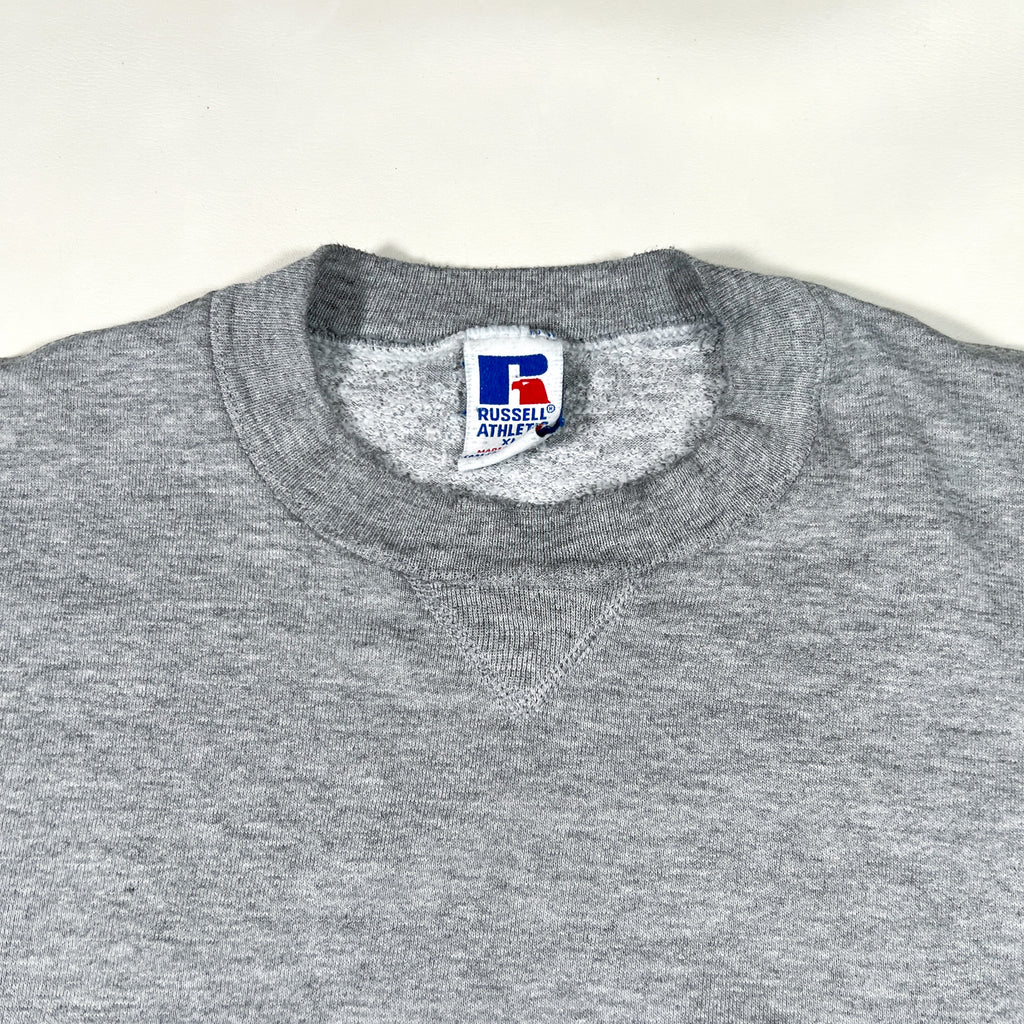 90s crewneck sweatshirt, vintage Russell Athletic, made in USA sweatshirt, gray fleece pullover, 1990s athletic wear, vintage basics, heavyweight crewneck, vintage sportswear, classic Russell logo, soft vintage sweatshirt