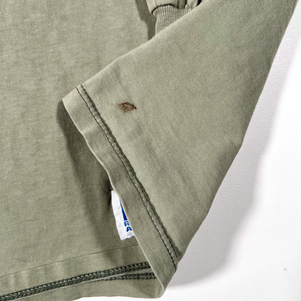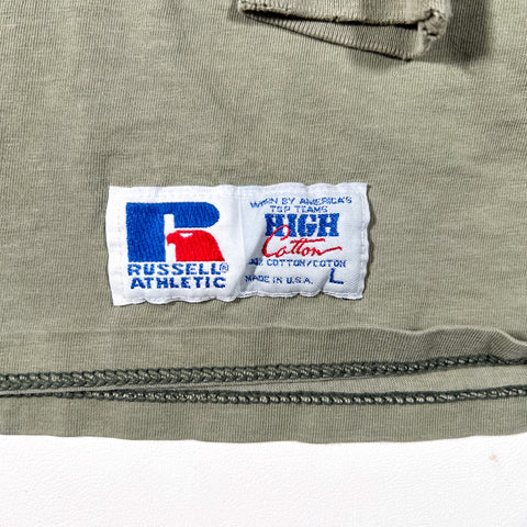 This is a vintage 1990’s Russell Athletic heavyweight long sleeve shirt in a muted sage/olive tone. Made in the USA and constructed from Russell’s classic high-cotton jersey, this piece has that soft, broken-in feel only true vintage provides. Elastic cuffs, single-stitch details, and original Russell tags intact.