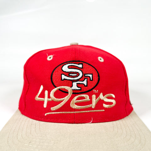 Classic 90’s San Francisco 49ers snapback hat by The Game, featuring bold embroidered team logos on the front and sides with the iconic “49ers” script across the crown. The tan brim and green undervisor give it that authentic vintage look and feel.
