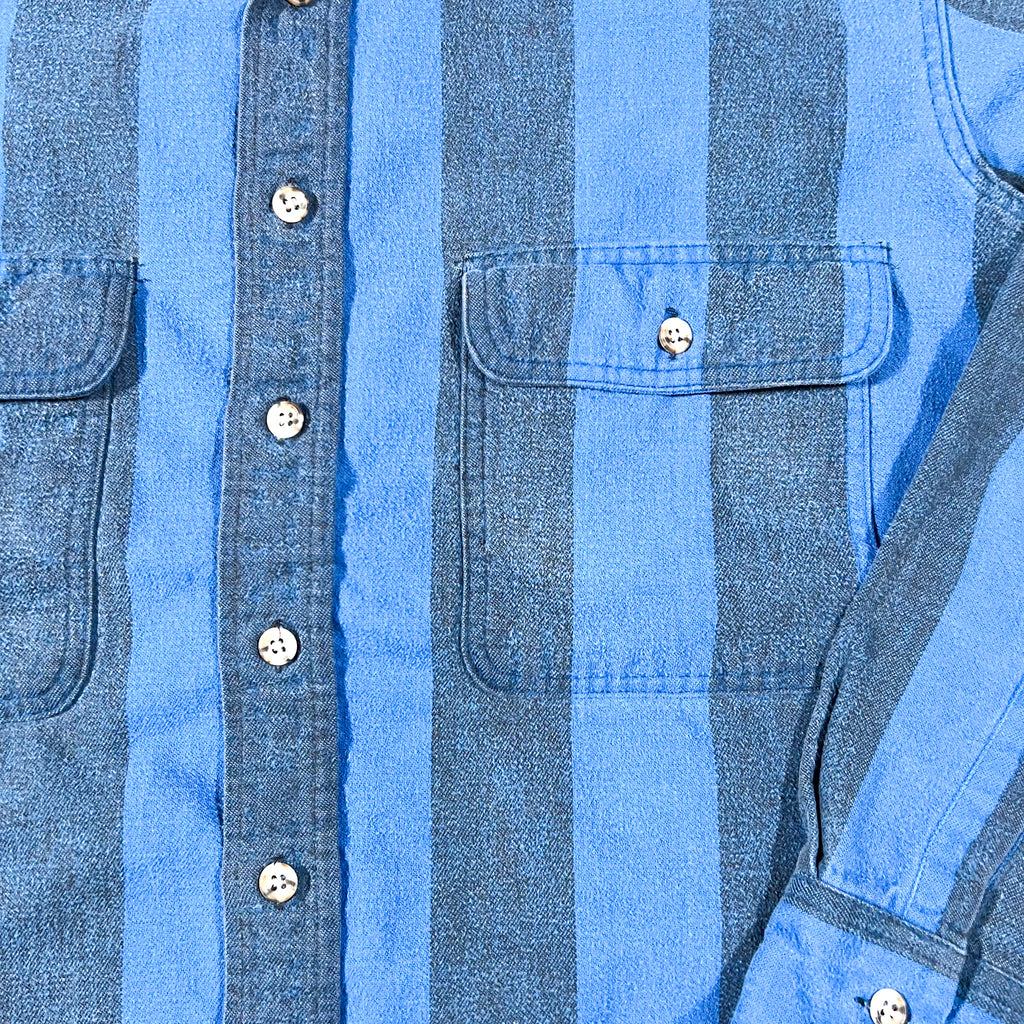 Vintage 1990’s St. John’s Bay heavyweight cotton button-up shirt featuring bold vertical stripes in two shades of blue. Made in the USA from imported fabric, this piece has a classic 90s outdoorsy/workwear feel with dual button-flap chest pockets, full button front, and a rounded hem. Soft, broken-in, and super wearable.
