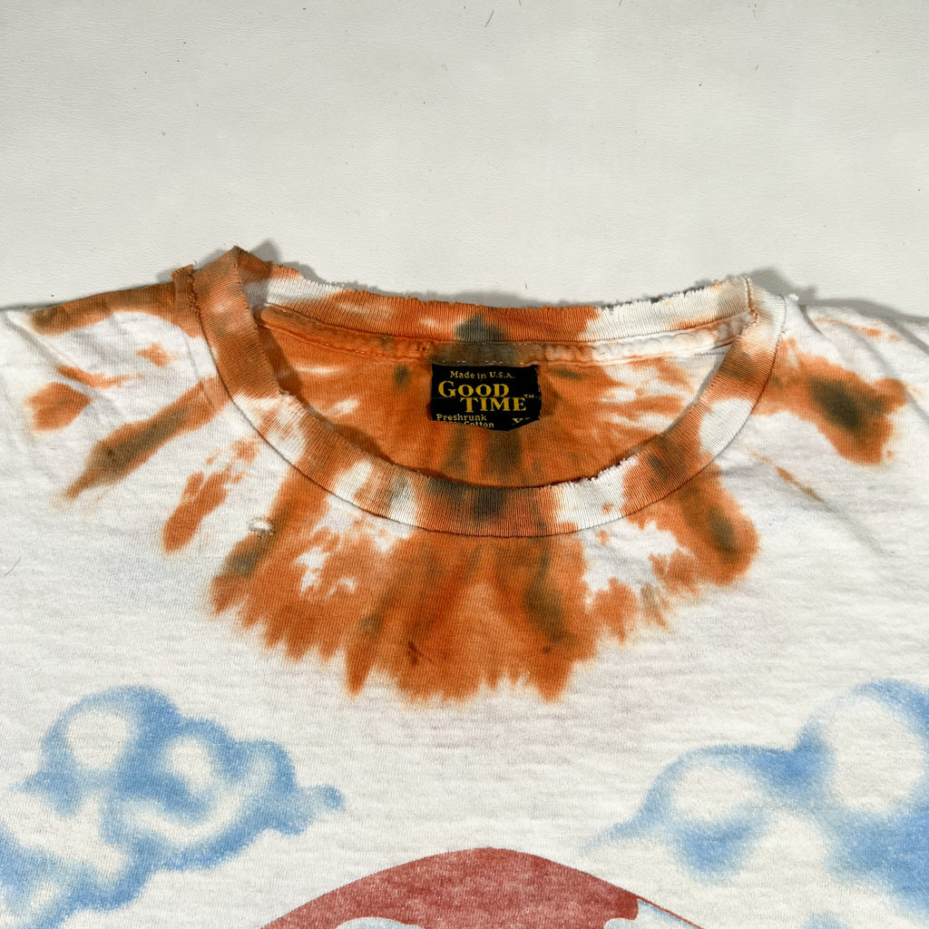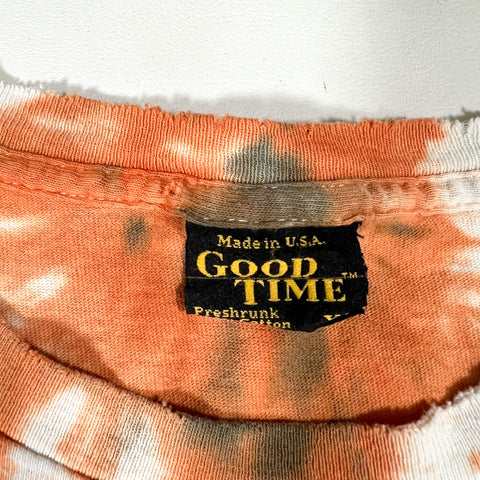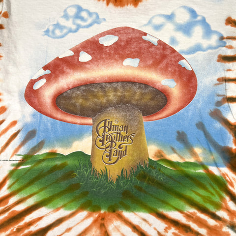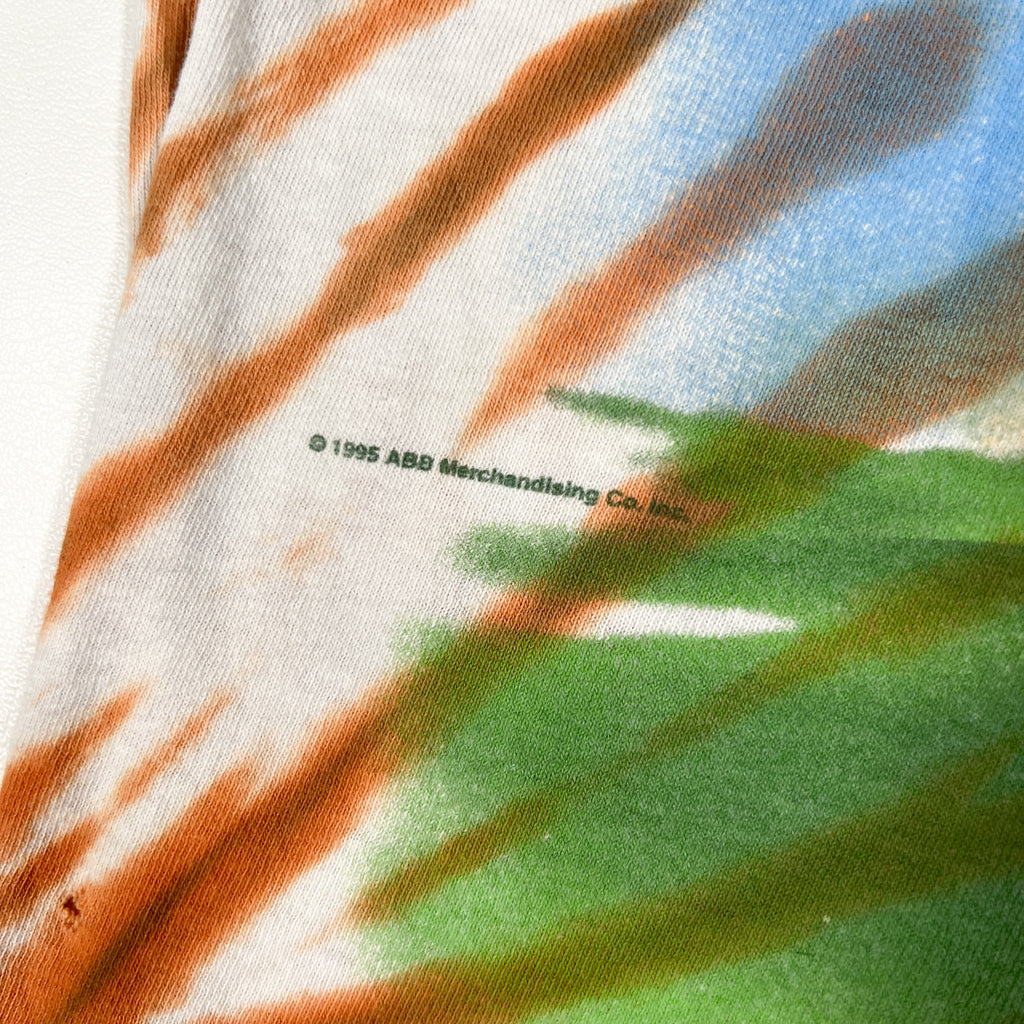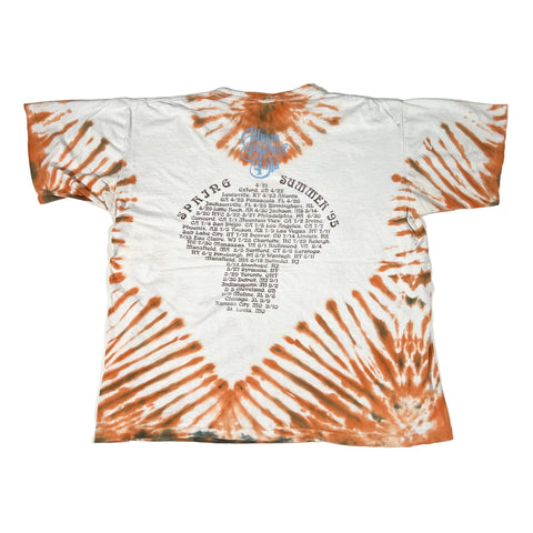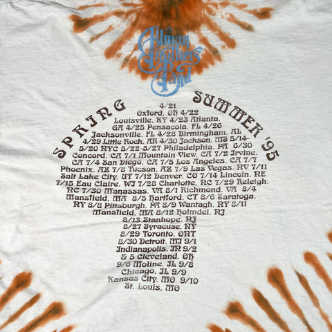 Authentic vintage 1995 The Allman Brothers Band Summer Tour tie-dye T-shirt featuring the classic mushroom graphic on the front and full tour date locations printed on the back. Printed on a Made in USA Good Time preshrunk cotton blank with bold orange and green spiral tie-dye. Iconic 90s jam band tour merch with strong color and graphics on both sides.