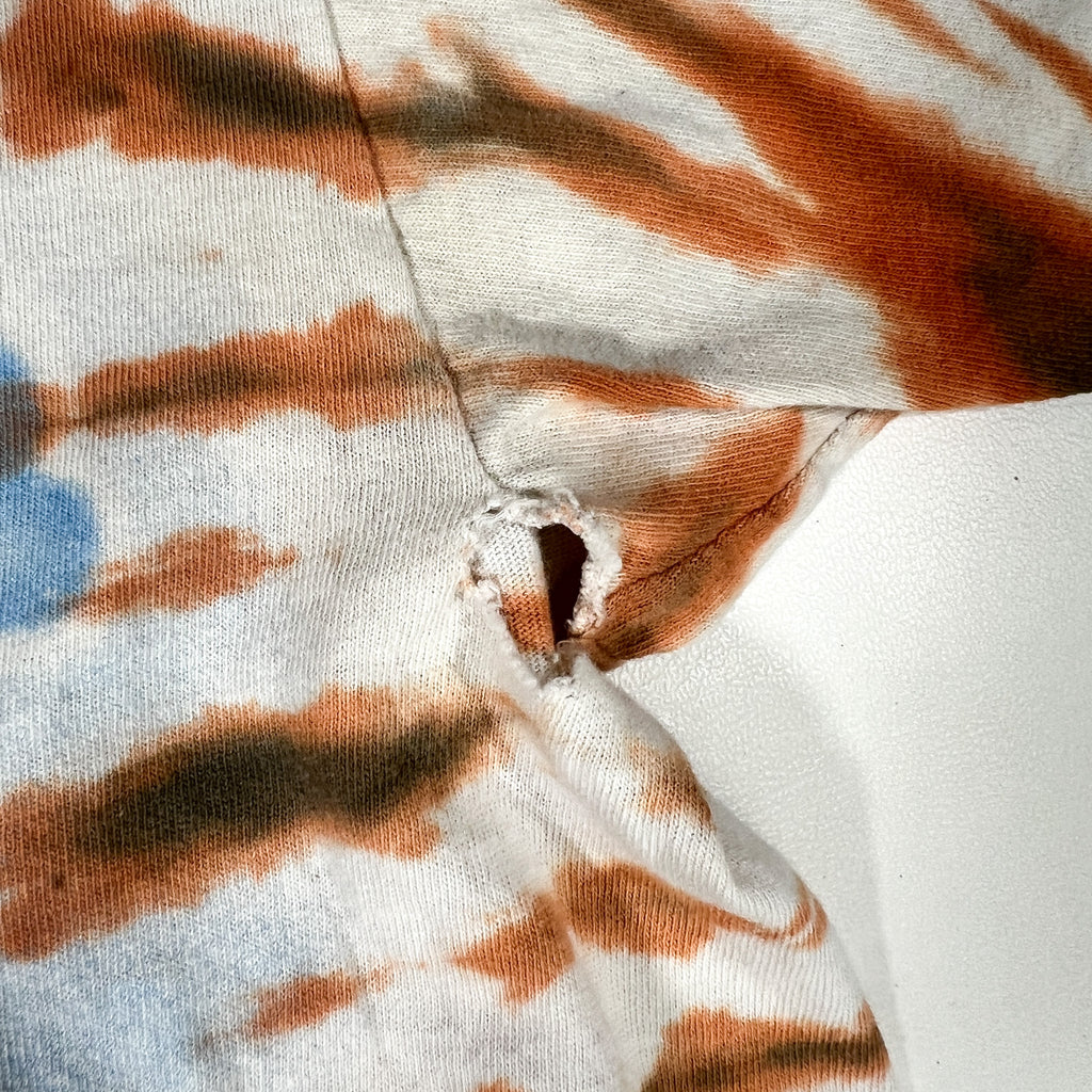 Condition: AS-IS vintage condition. There is a hole/tear at the right underarm seam and small wear at the collar as shown in photos. No other major issues noted. Please review all photos for exact condition.