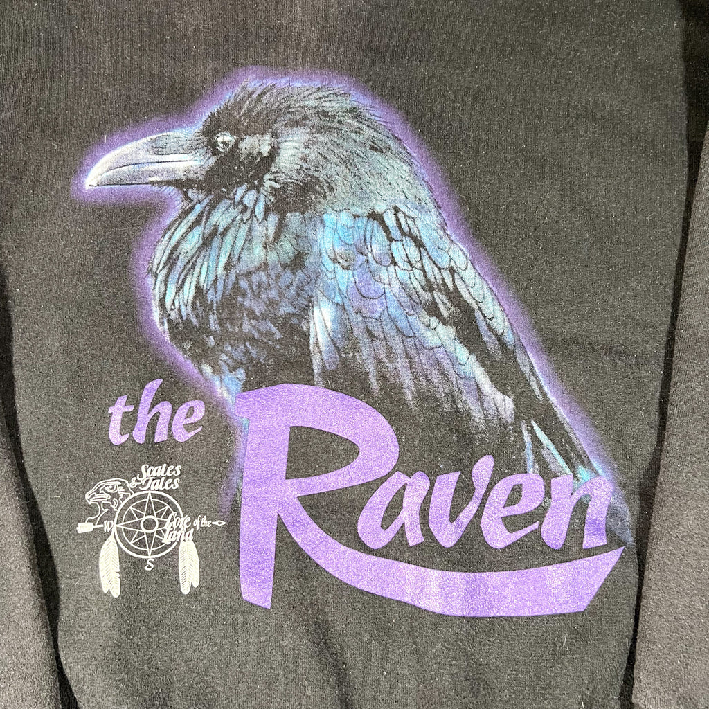 Vintage 1990s “The Raven” sweatshirt featuring a striking purple and blue wildlife graphic by Scales & Tales and Love of the Land, printed on a black Oneita Power-Sweats crewneck.