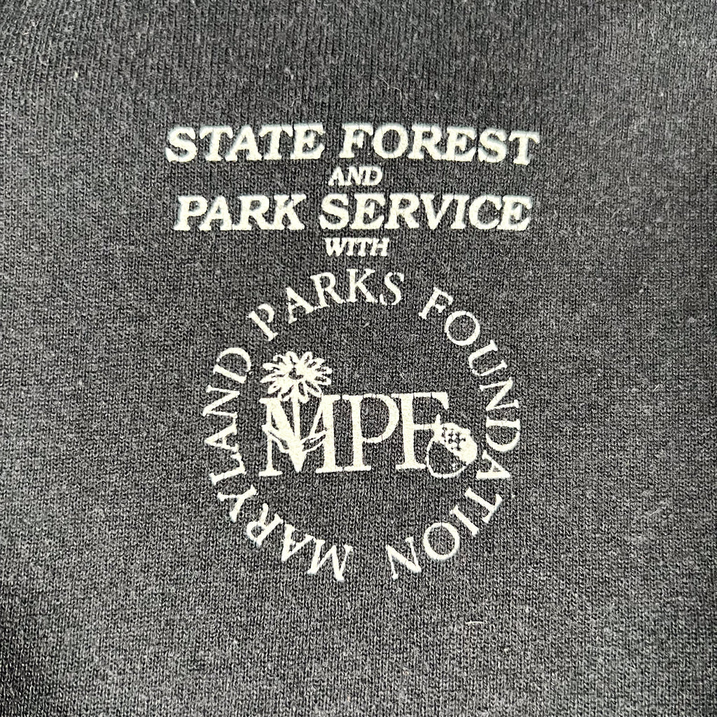 Made in USA from a heavyweight 50/50 cotton-poly blend, this piece embodies the bold, artistic wildlife prints of the late 80s and early 90s. The front showcases a large raven portrait in vivid color, while the back features a small Maryland Parks Foundation and State Forest & Park Service logo print.
