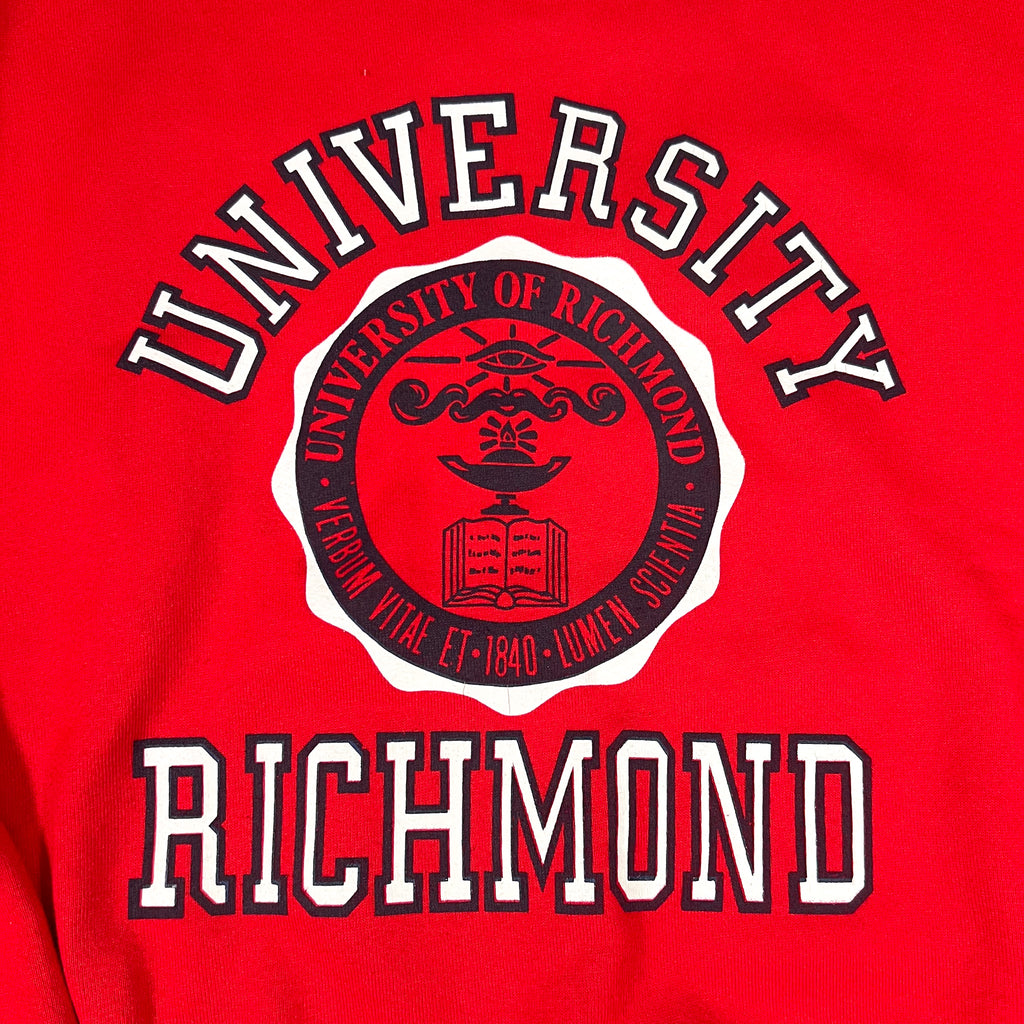 Classic red base with ribbed cuffs, collar, and hem. Soft interior fleece and crisp collegiate lettering make this a perfect staple for Richmond alumni, locals, or vintage college apparel fans.