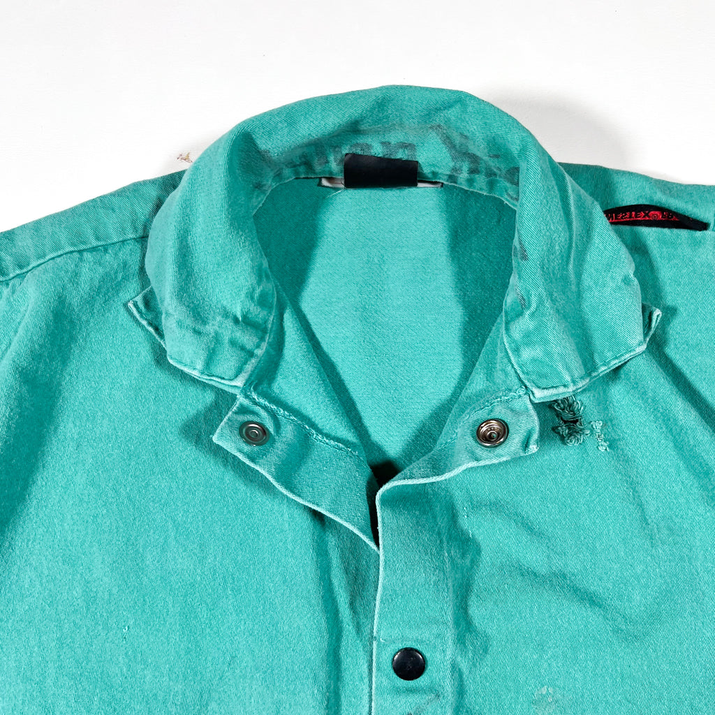 Vintage 1990s Westex FR work jacket in a faded teal/green colorway, made from flame-resistant cotton fabric designed for industrial use. Features a snap-front closure, structured collar, adjustable snap cuffs, and a cropped, boxy workwear fit. The fabric has softened and faded over time, giving it strong character and authentic wear.