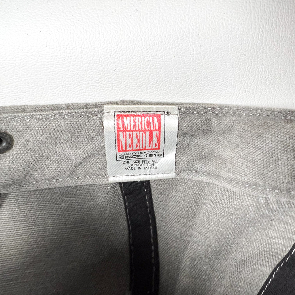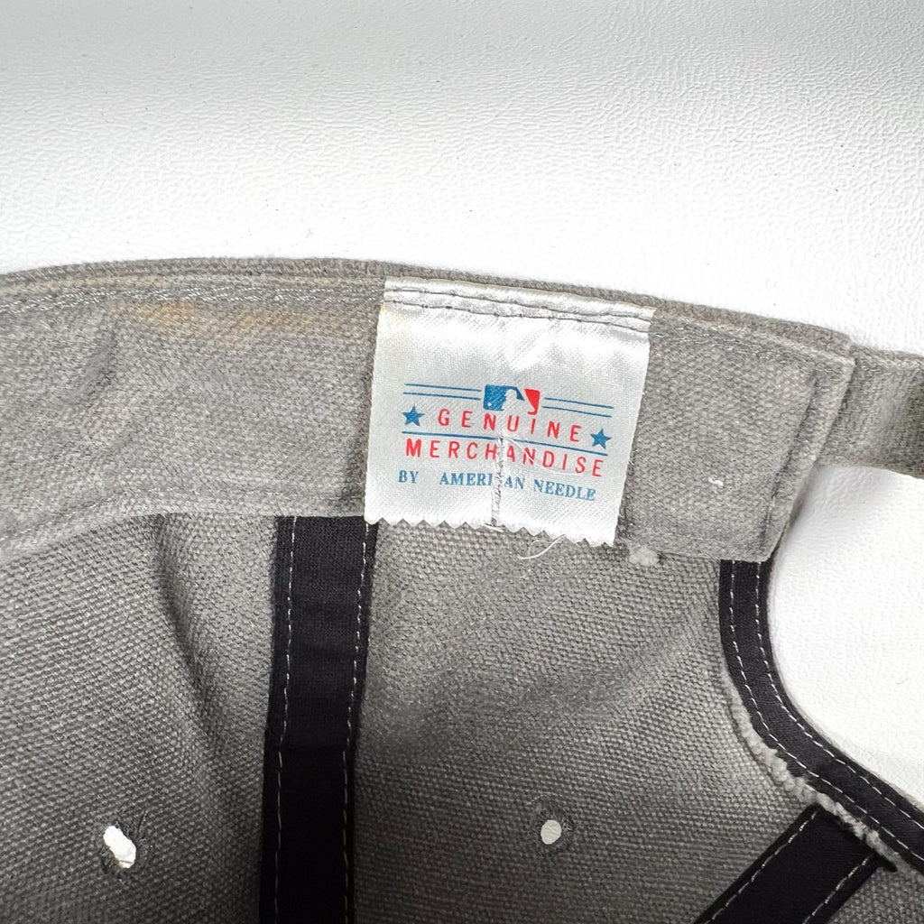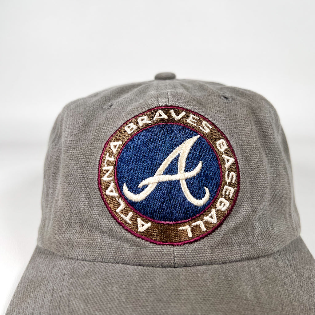 atlanta braves hat, vintage braves cap, american needle braves, mlb strapback hat, distressed baseball hat, washed gray braves hat, 90s style braves cap, mlb fan gear, vintage sportswear hat, adjustable baseball cap, worn in dad hat, neutral everyday hat
