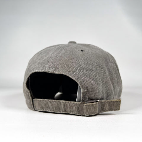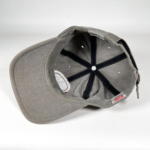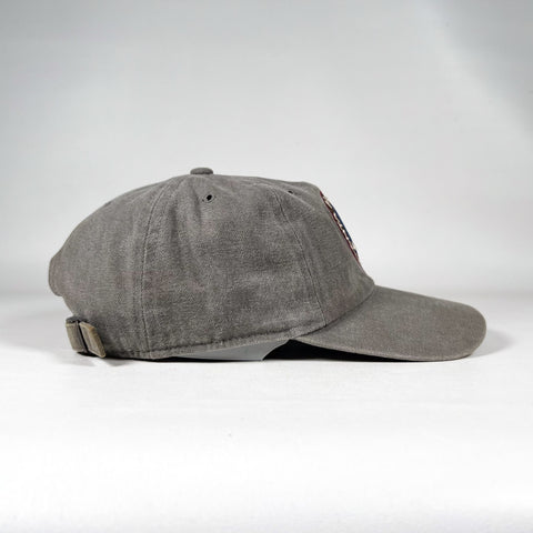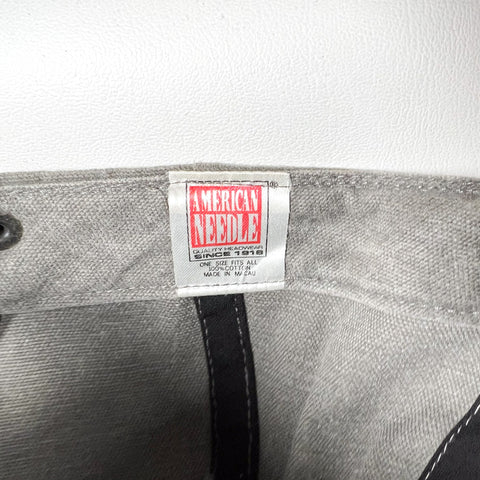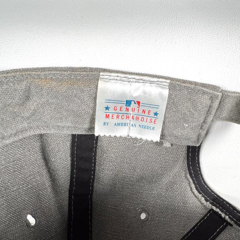 Vintage Atlanta Braves strapback hat with a worn-in gray canvas look and raised embroidered circular team logo patch on the front. Features an adjustable fabric strapback with metal slider and American Needle MLB Genuine Merchandise tags. Perfect everyday fan wear with that broken-in, vintage-washed look that feels like a day-one favorite straight out of the box.