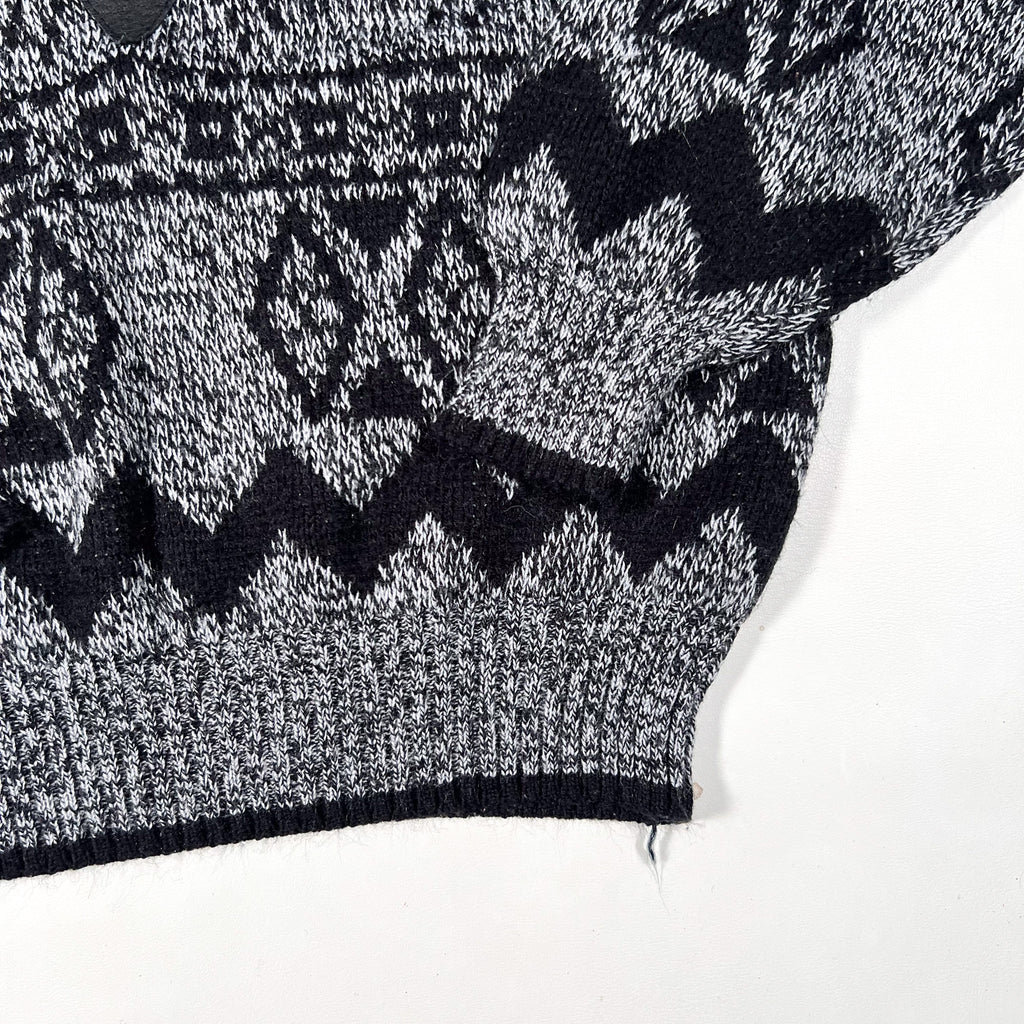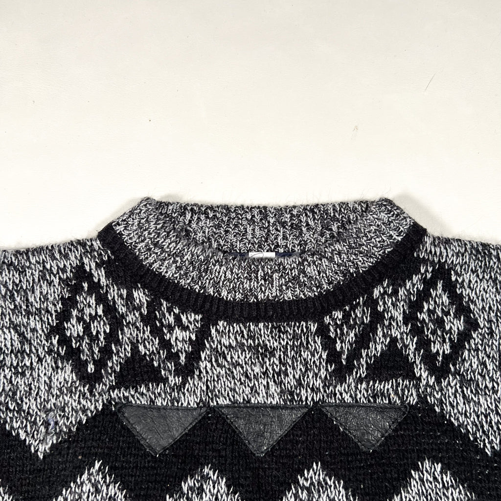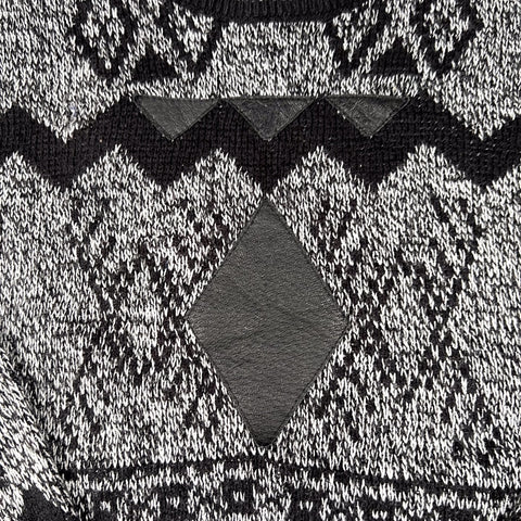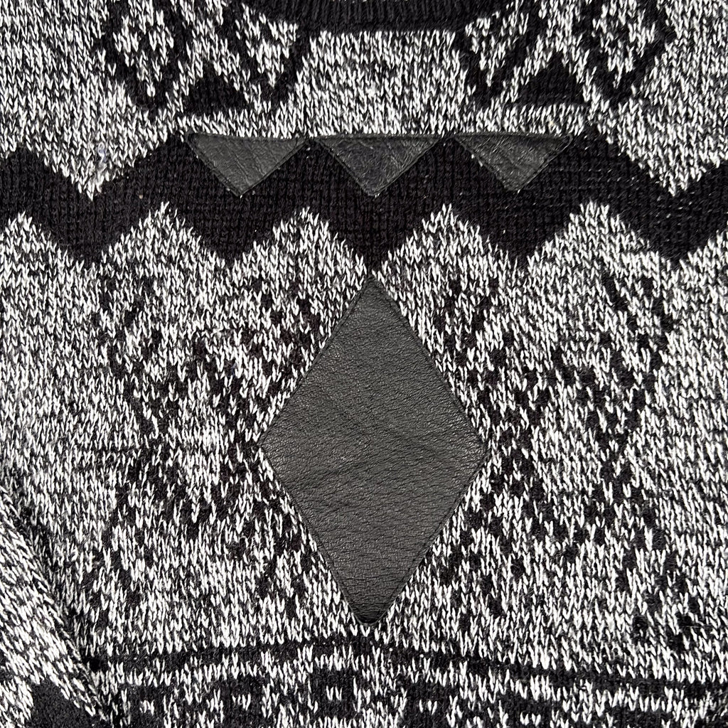 Vintage Barnaby knit sweater featuring a bold black and gray geometric pattern with diamond and zig-zag motifs throughout. Constructed from an acrylic knit with a medium-weight feel, finished with ribbed collar, cuffs, and hem. Features a genuine leather diamond patch at the chest and leather triangle accents across the upper body, adding strong 1990s character.