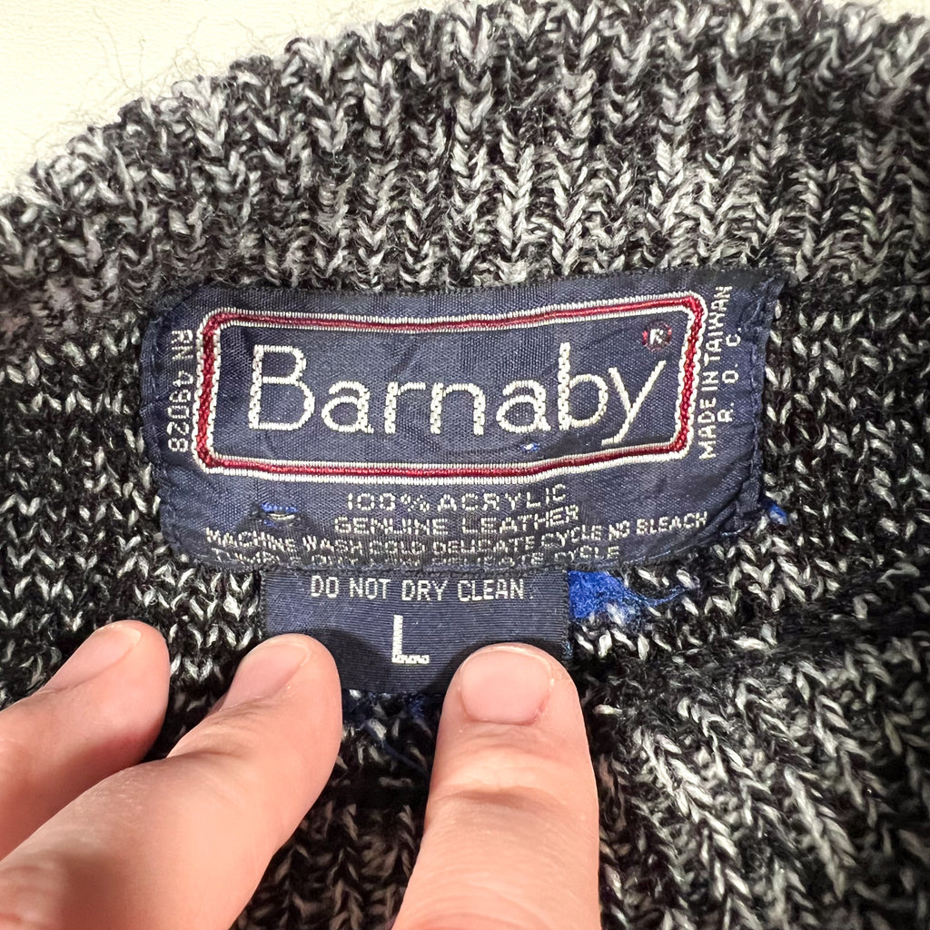 vintage barnaby sweater, 90s geometric sweater, leather patch sweater, patterned knit sweater, vintage black gray sweater, 90s knit sweater
