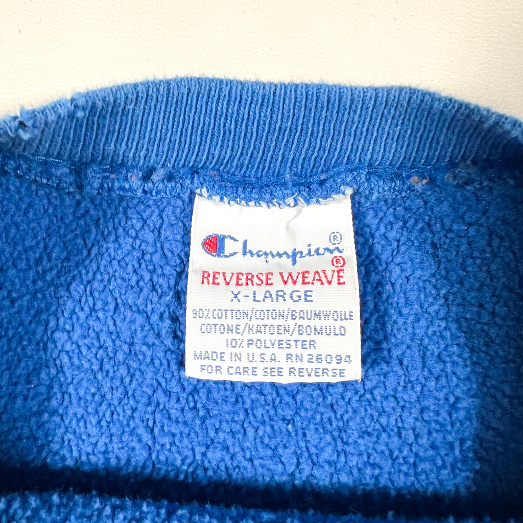 vintage champion reverse weave sweater sweatshirt blue 90s athletic sportswear hip hop streetwear usa made spellout crewneck retro classic heavyweight cobblestore vintage richmond va